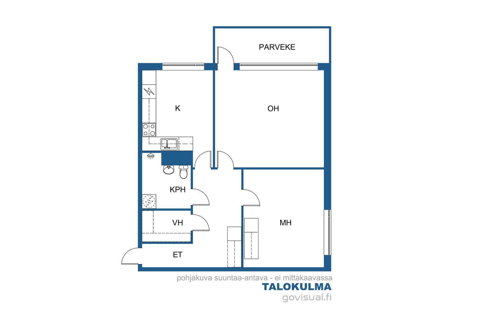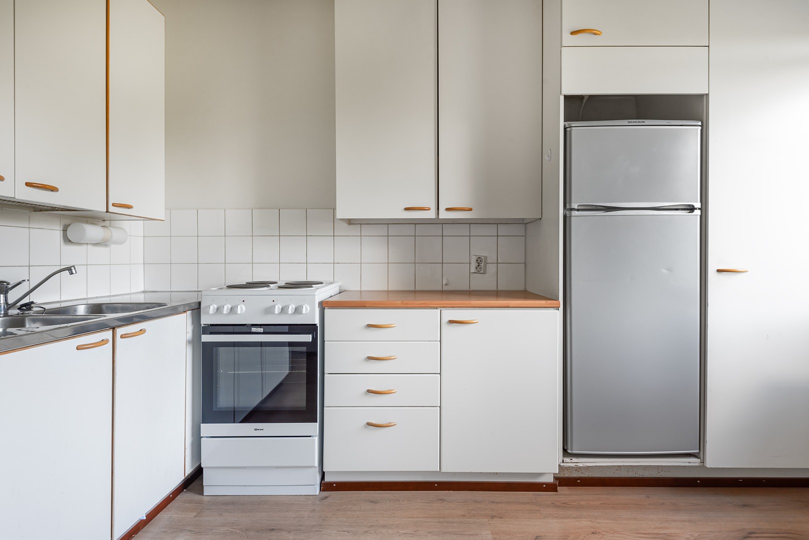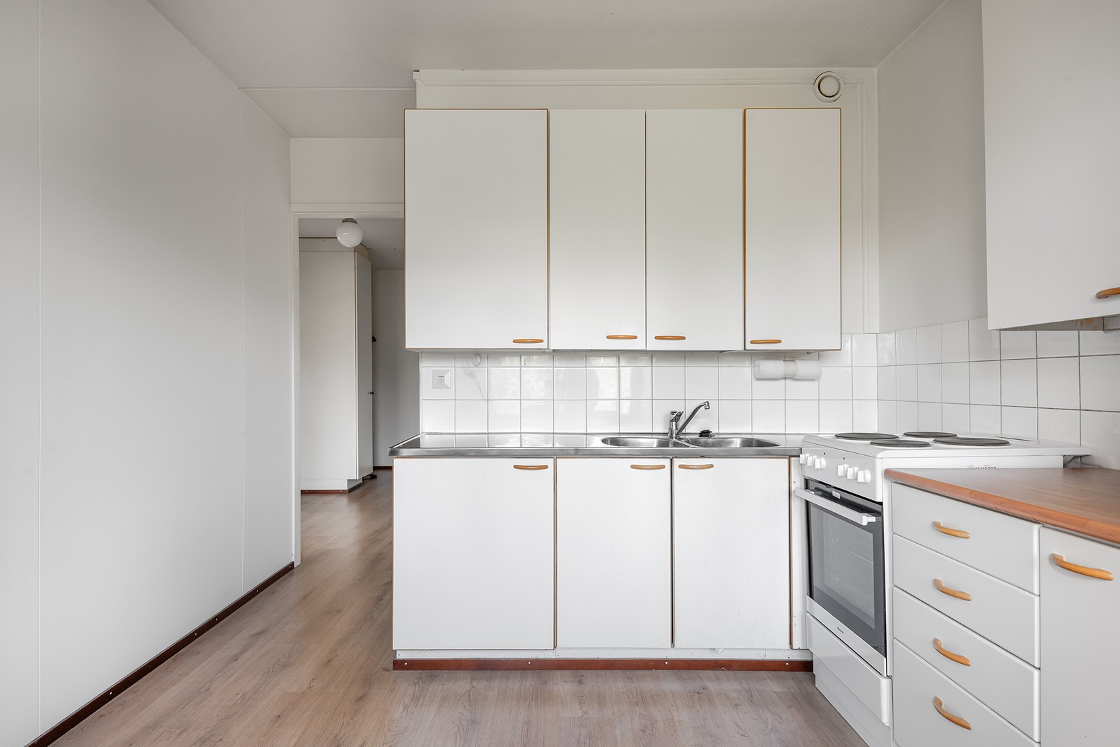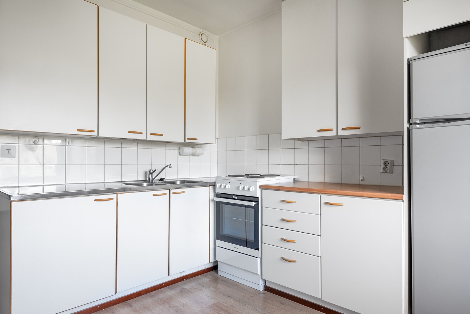 Asunnossa on avara olohuone josta on kulku lasitetulle parvekkeelle. Parvekkeelta avautuvat näkymät kaupungin suuntaan. Keittiö on siistikuntoinen ja kaappi- ja laskutilaa löytyy reilusti. Pöytä mahtuu ikkunan ääreen helposti. Kylpyhuone on iso ja pesukone menee tilaan vaivatta. Lisäksi huoneistoon kuuluu erillinen vaatehuone.