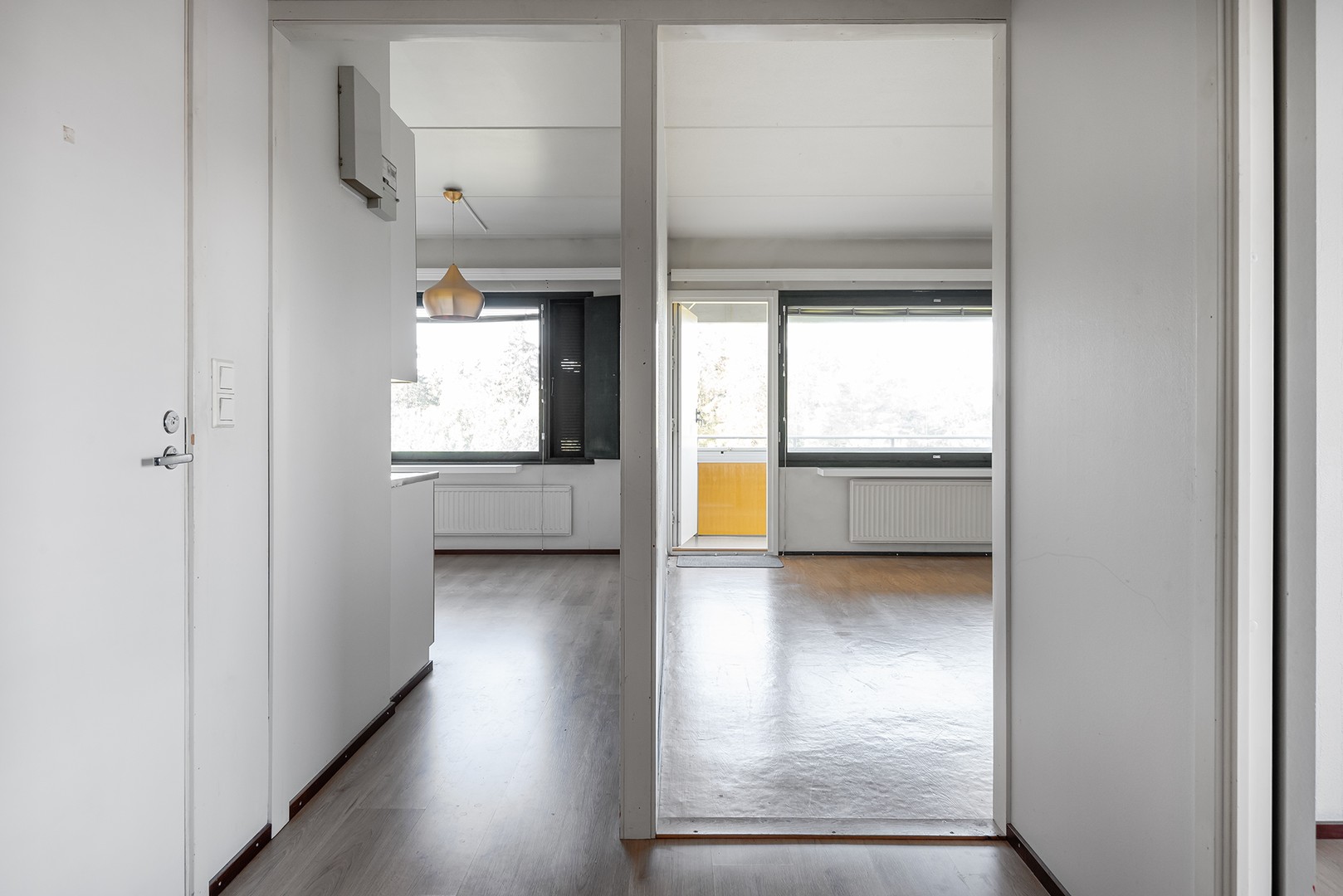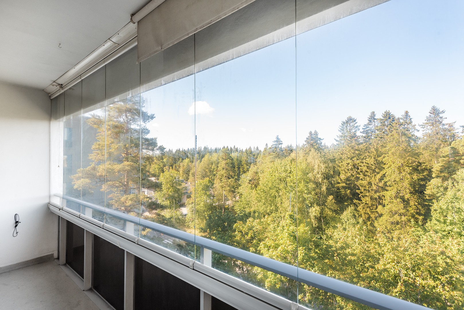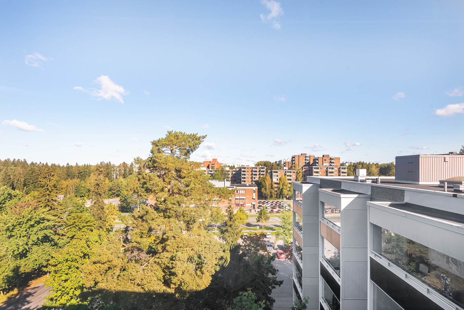 Huoneisto sijaitsee hissillisen talon ylimmässä eli seitsemännessä asuinkerroksessa. Ikkunoista ja lasitetulta parvekkeelta avautuvat hyvät näkymät yli alueen.