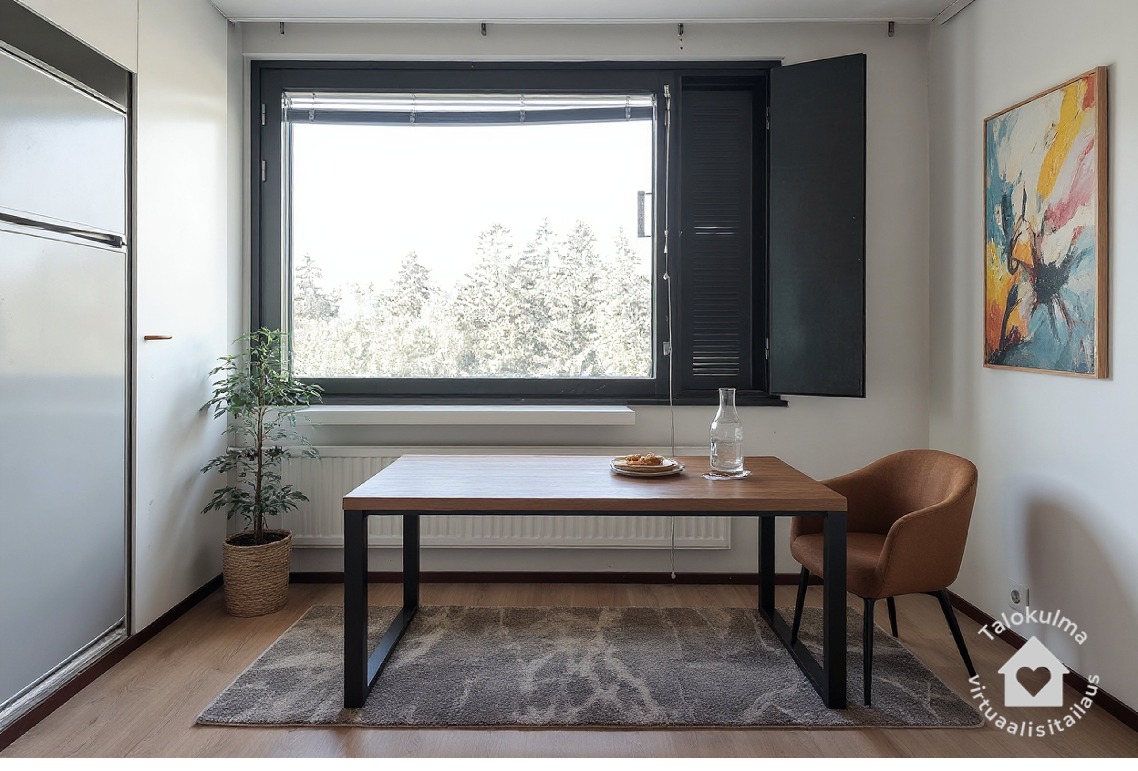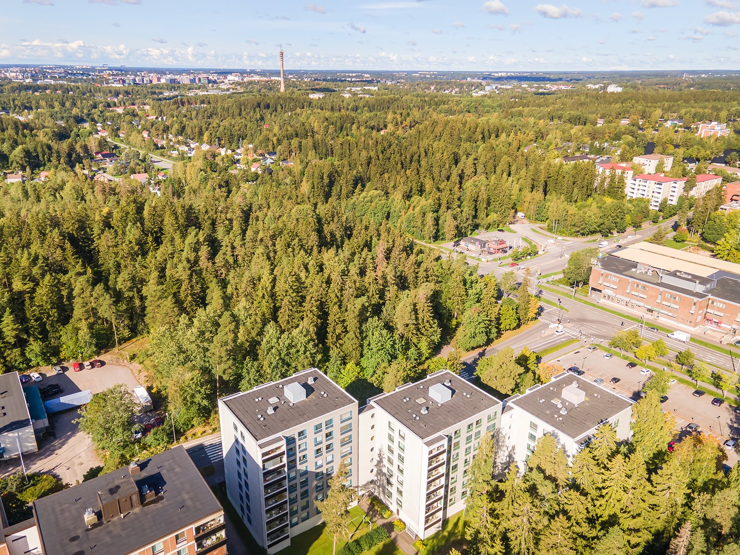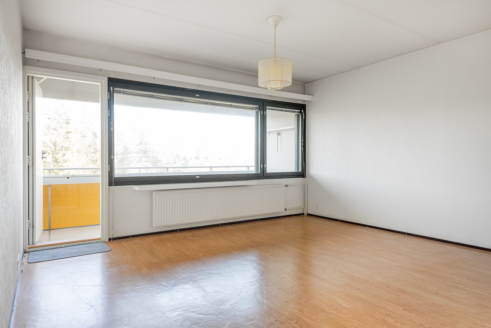 Huoneisto sijaitsee hissillisen talon ylimmässä eli seitsemännessä asuinkerroksessa. Ikkunoista ja lasitetulta parvekkeelta avautuvat hyvät näkymät yli alueen.