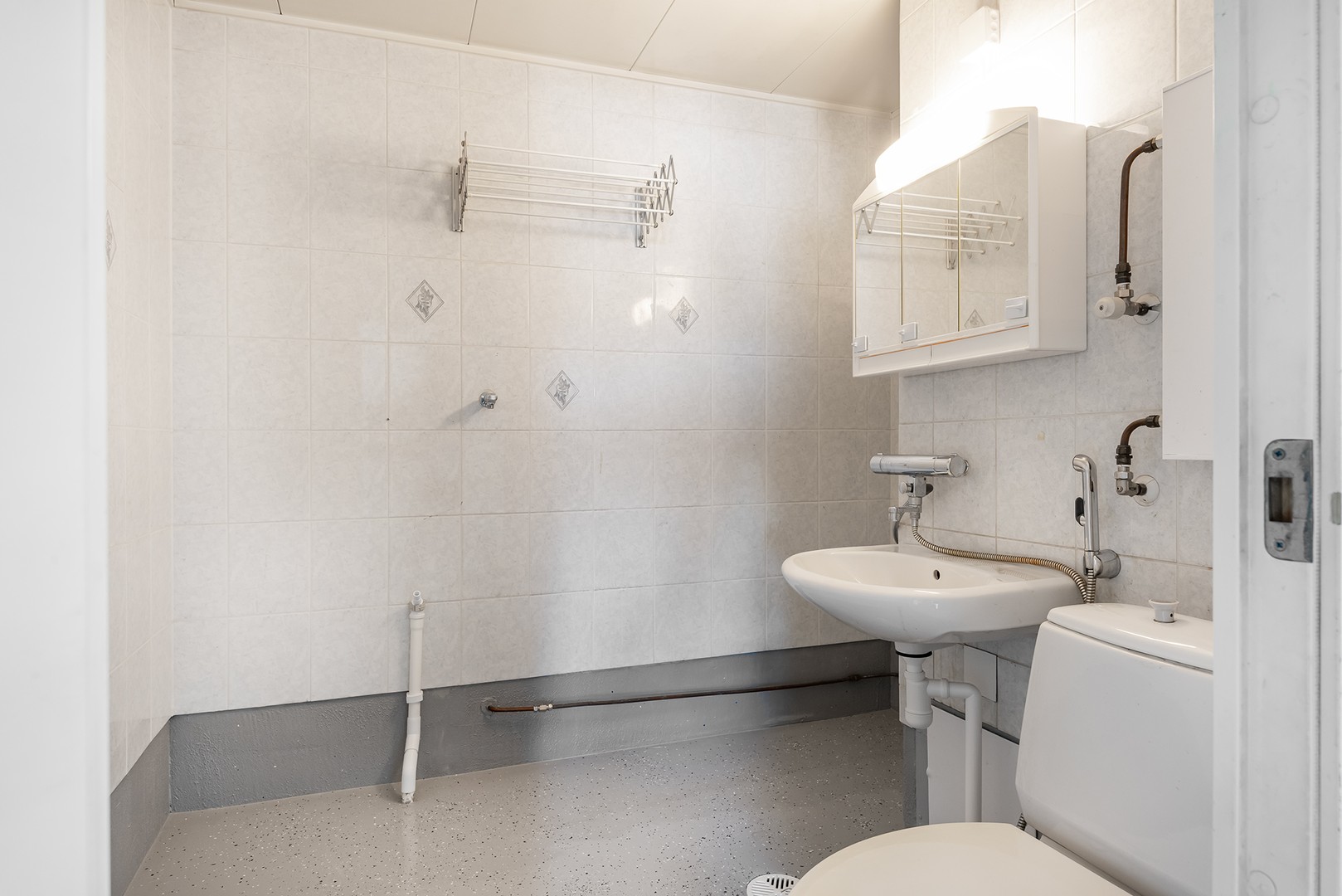 Tilava kylpyhuone jonne mahtuu pesukone. Taloyhtiö uusinut lattian ja muuttanut seinäkaivon lattiakaivoksi vuonna 2023.