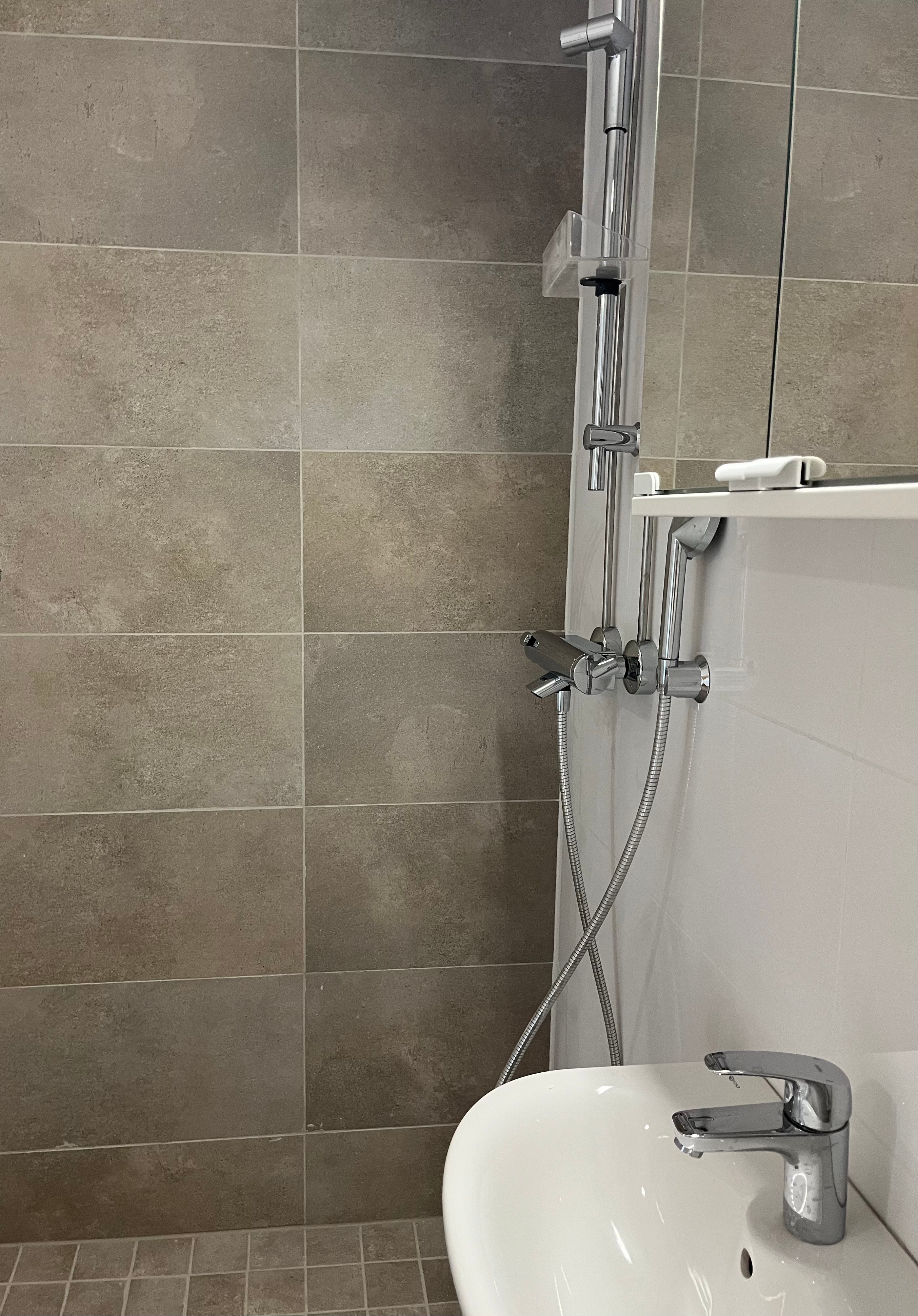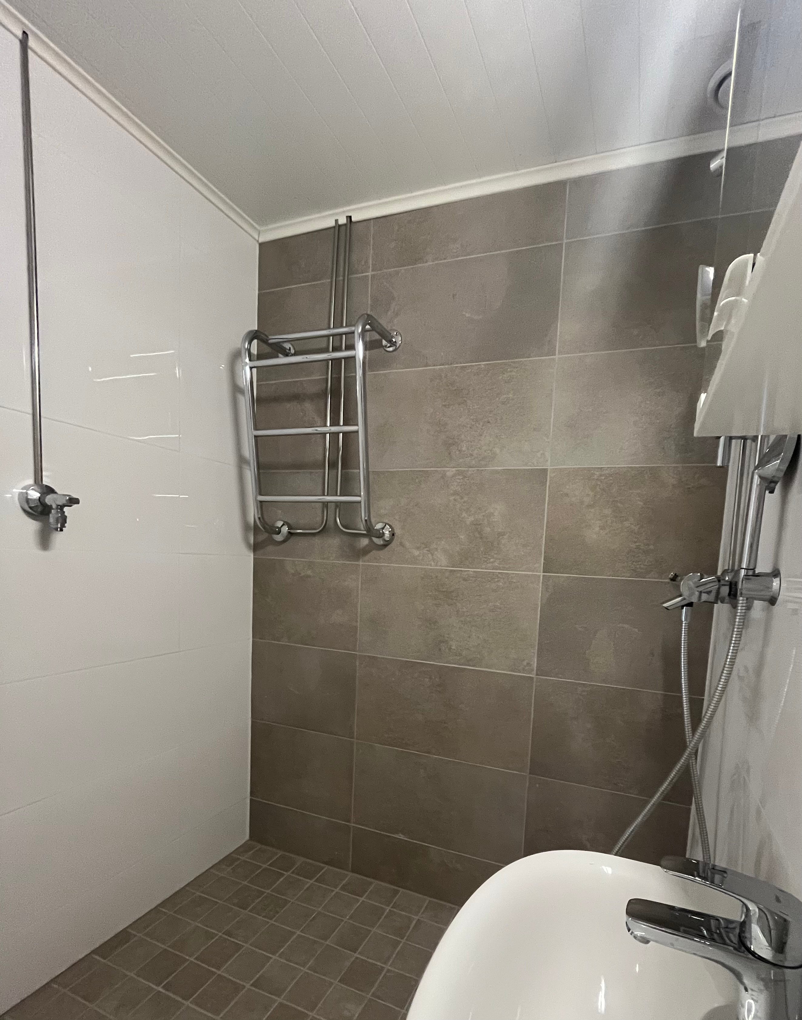 Tyylikäs remontoitu kylpyhuone pesukoneliitännällä ja pyyhekuivaimella