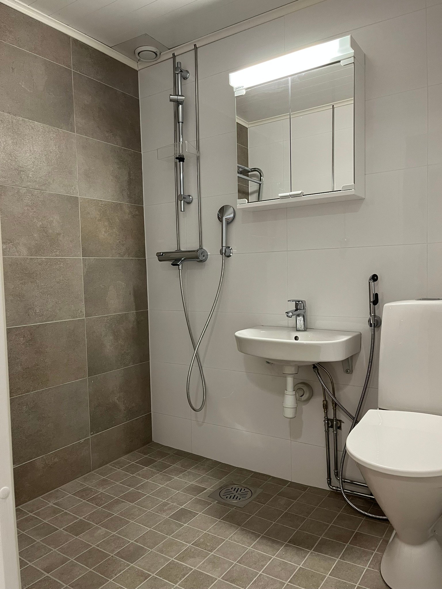 WC-istuin, suihku, pesukoneliitäntä, bidee-suihku, pesuallas ja peilikaappi