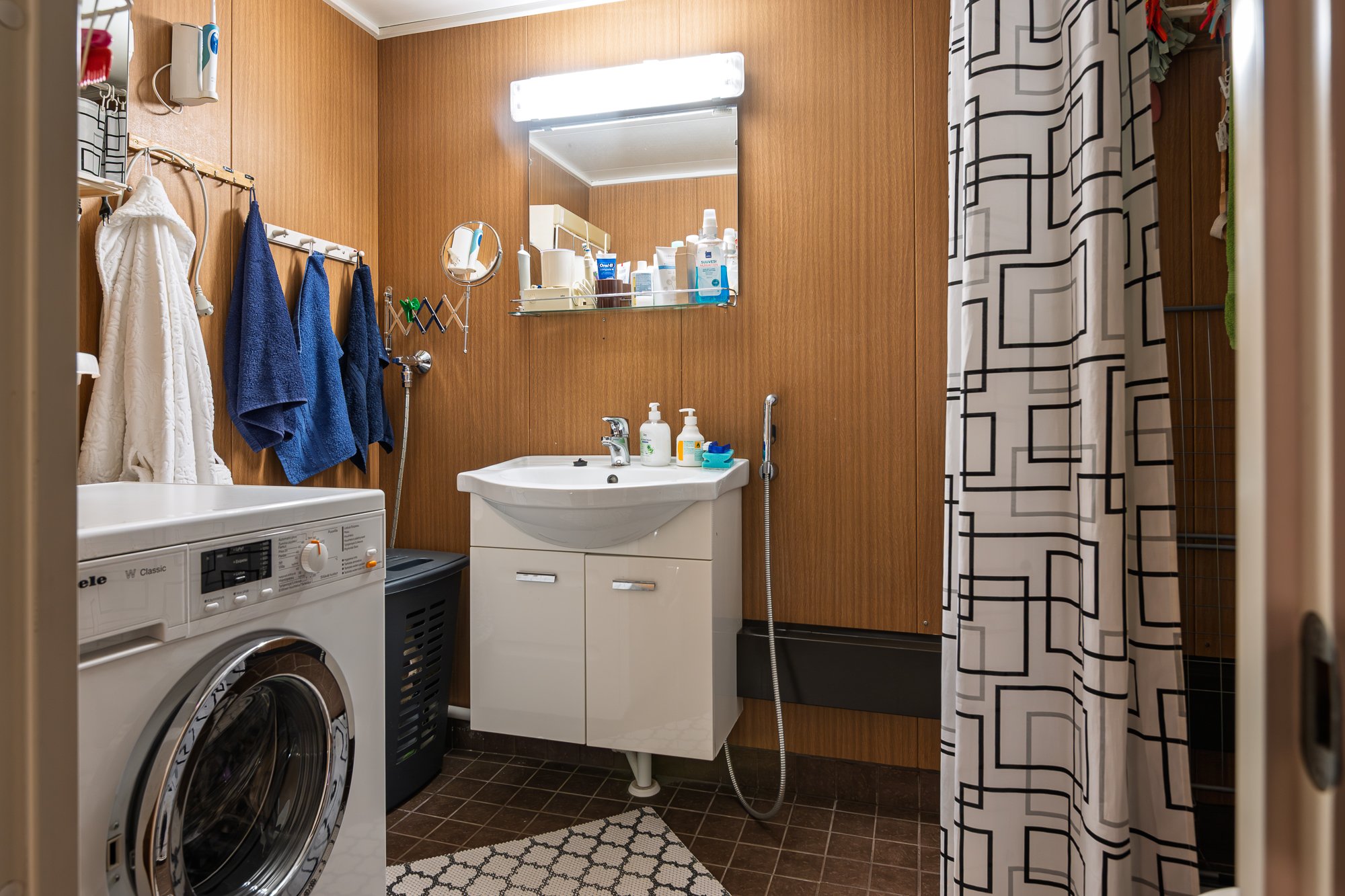 WC-istuin, suihku, pesukoneliitäntä, peili ja allaskaappi