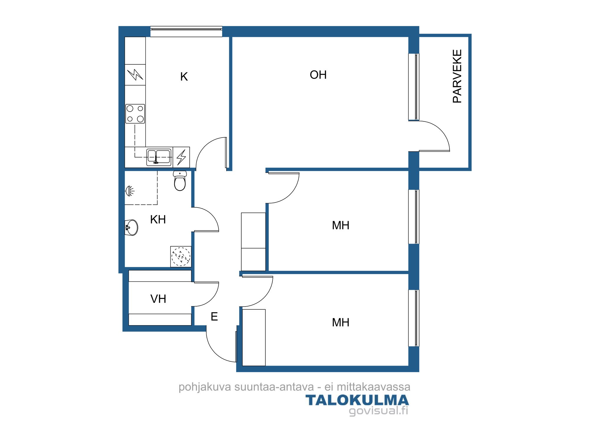 Asunnossa on avara olohuone ja kaksi kivan kokoista makuuhuonetta sekä keittiö, josta löytyy kaikki tarvittava. Kaappi- ja laskutilaa on keittiössä mukavasti ja pöytä mahtuu ikkunan ääreen helposti. Kylpyhuone on siisti ja myös pesukoneelle on kylpyhuoneessa tilaa. Olohuoneesta on kulku huoneiston lasitetulle parvekkeelle. Parveke on maantasalla takapihan puolella, mutta asunto sijaitsee talon toisessa kerroksessa. Huoneiston alapuolella ei asuta.