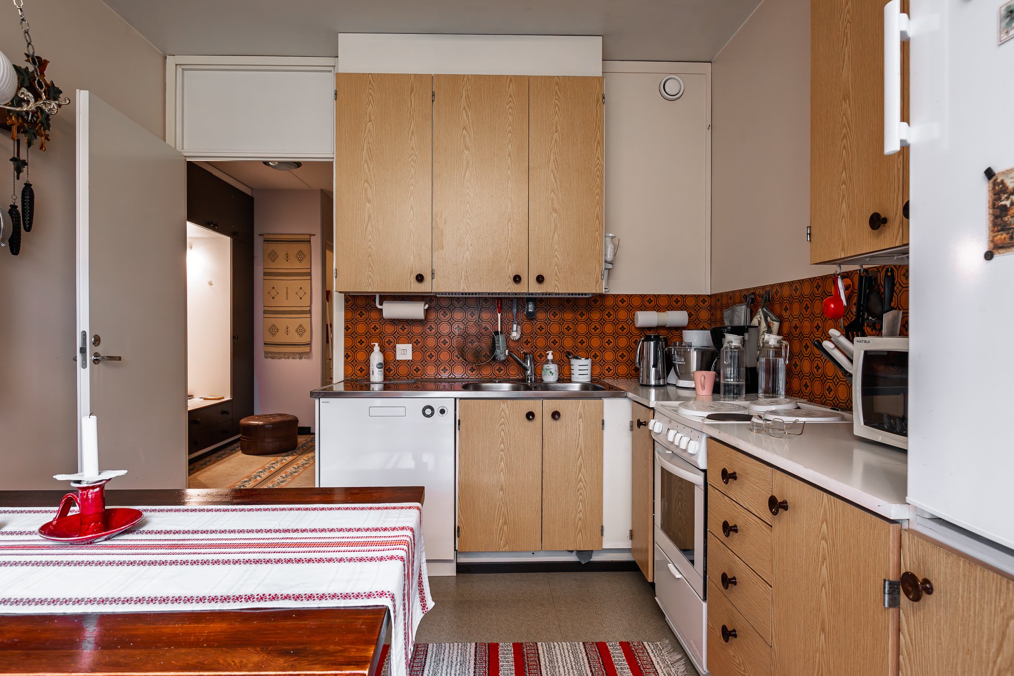 Jääkaappi, uuni, astianpesukone. Keittiössä mukavasti kaappitilaa ja pöytä mahtuu ikkunan ääreen. Keittiö alkuperäinen mutta siisti.