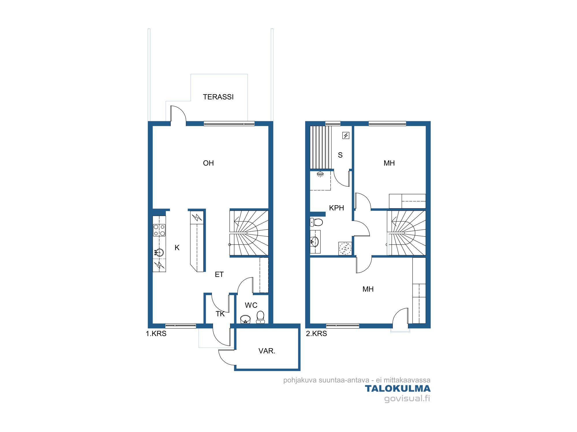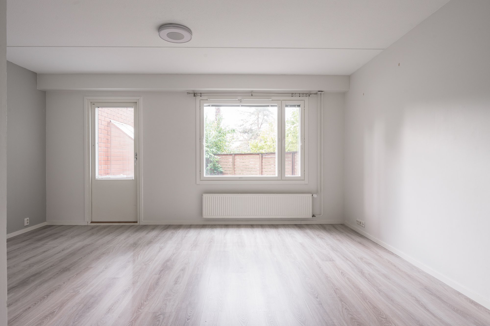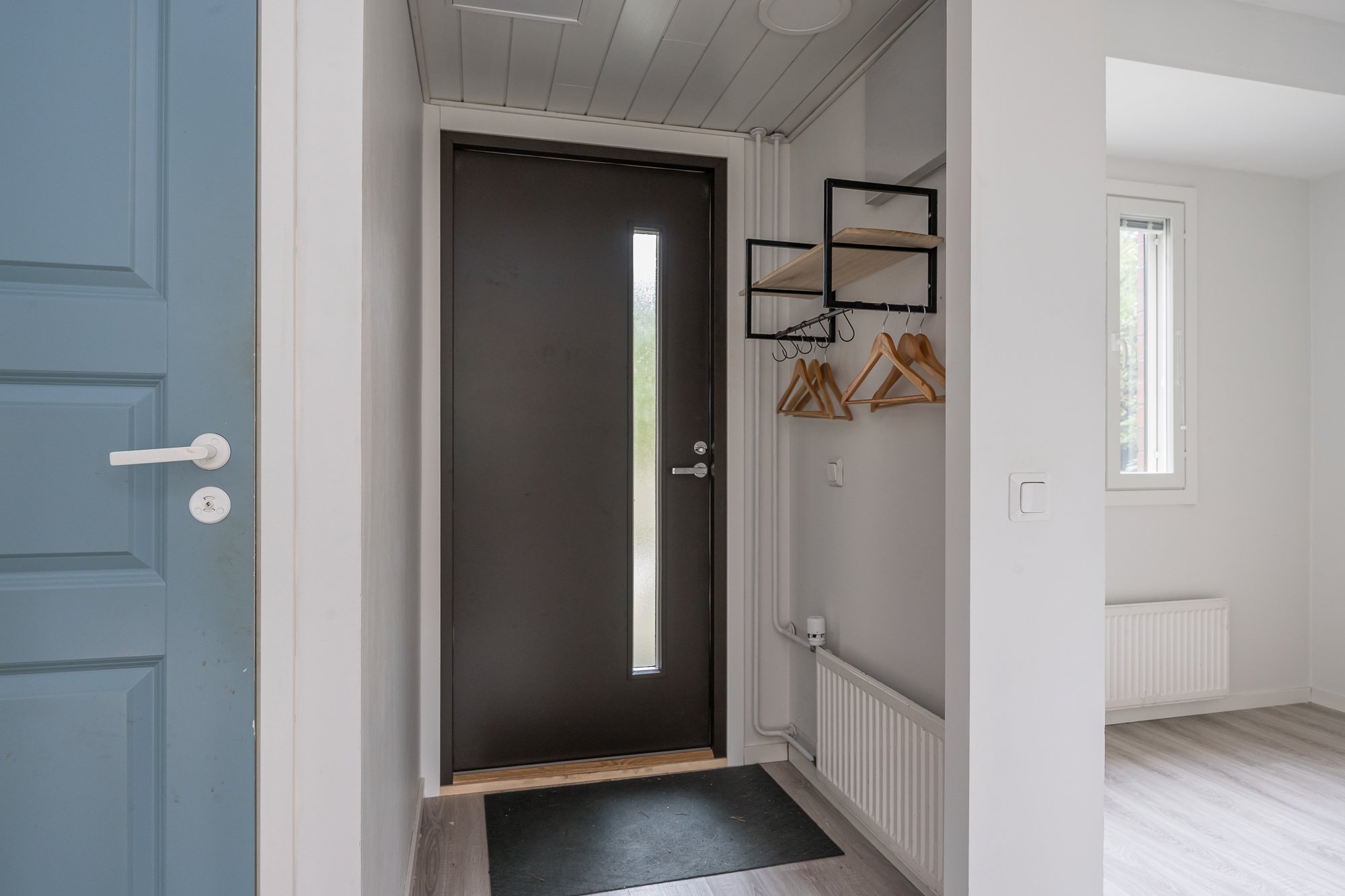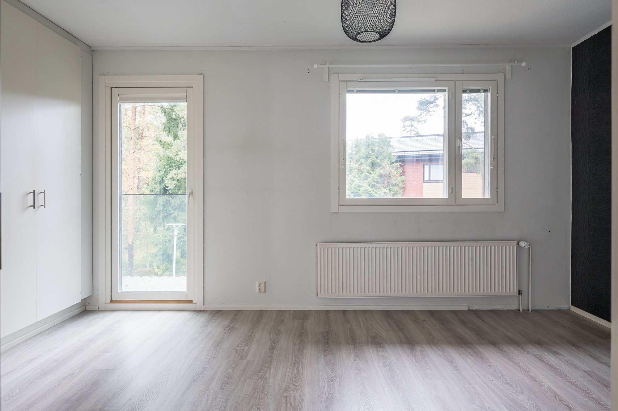 Asunnon alakerrassa on iso ja avara olohuone josta on kulku huoneiston takapihalle. Keittiöstä löytyy kaikki tarvittava ja pöytä mahtuu ikkunan ääreen. Asunnon yläkerrassa on kaksi tilavaa makuuhuonetta. Yläkerran kylpyhuoneen yhteydessä on huoneiston oma sauna ja pesukone mahtuu laatoitettuun kylpyhuoneeseen helposti. Kylpyhuoneessa on vessa ja erillinen wc löytyy lisäksi alakerrasta. Yläkerran ikkunoista avautuvat näkymät etupihalle. Takapiha on suojaisa ja helppohoitoinen.