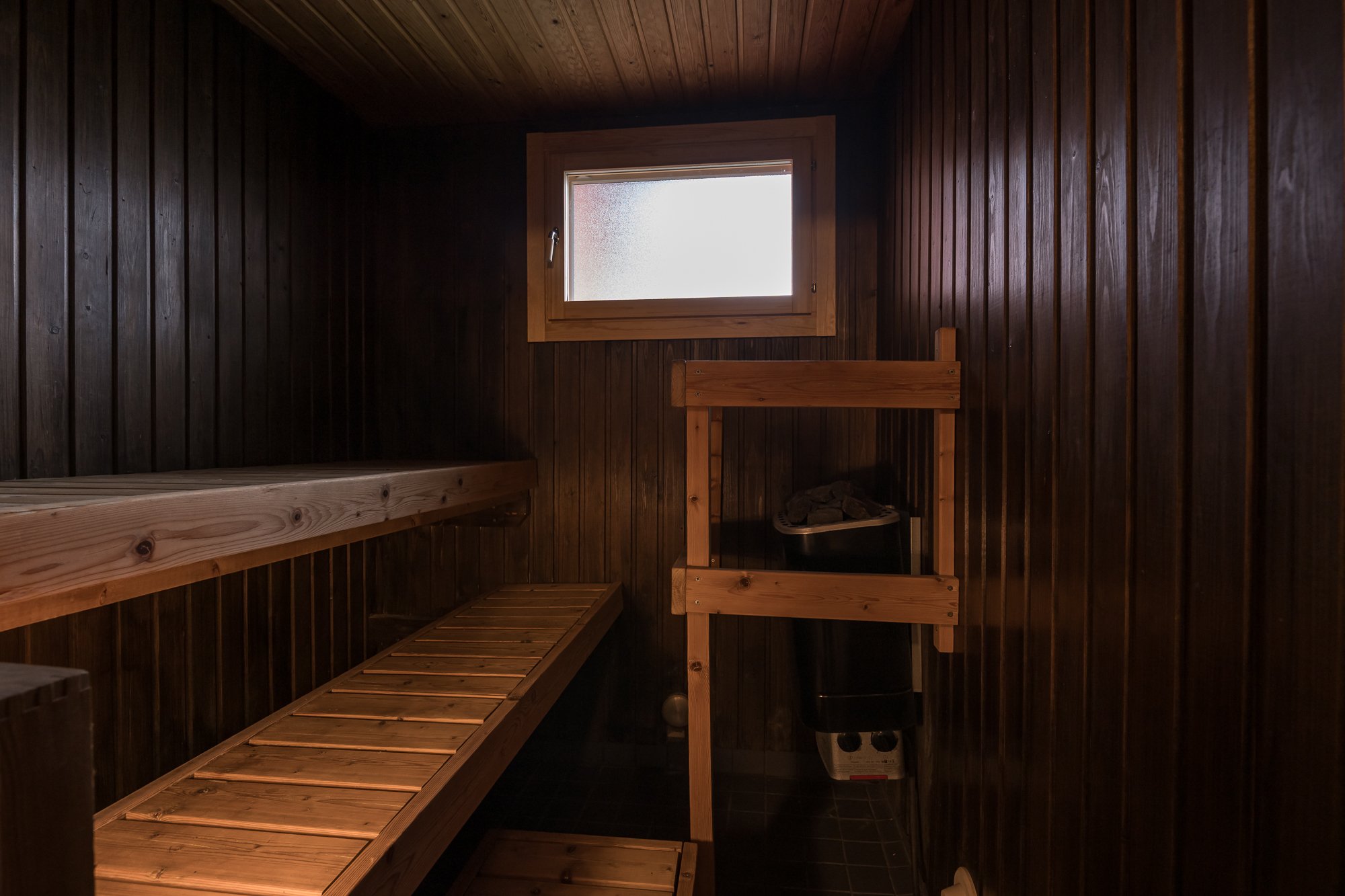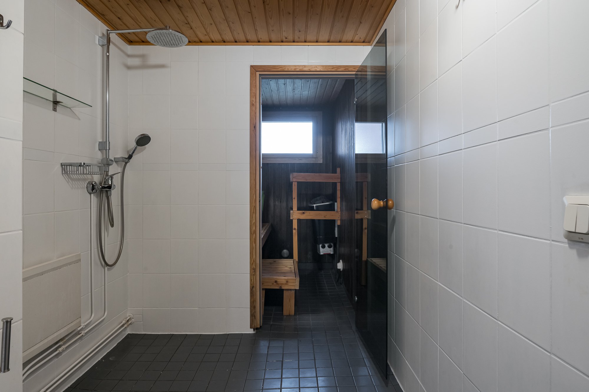 Iso ja avara, laatoitettu kylpyhuone jonka yhteydessä oma sauna. Pesukone mahtuu tilaan helposti.