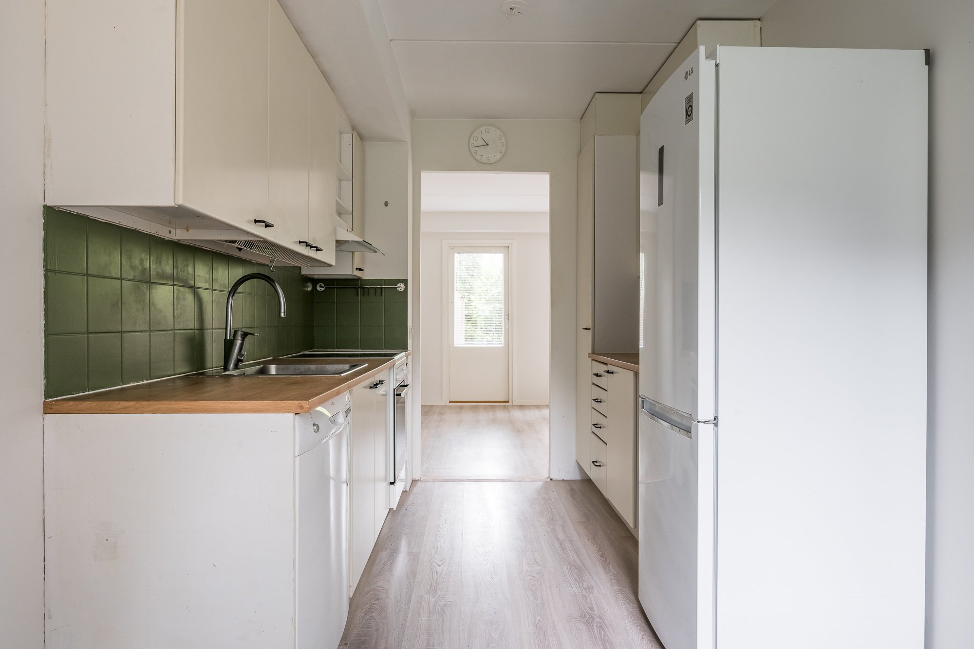 Jääkaappipakastin, uuni, liesituuletin, astianpesukone. Läpikuljettava keittiö, jonne mahtuu myös pöytä.