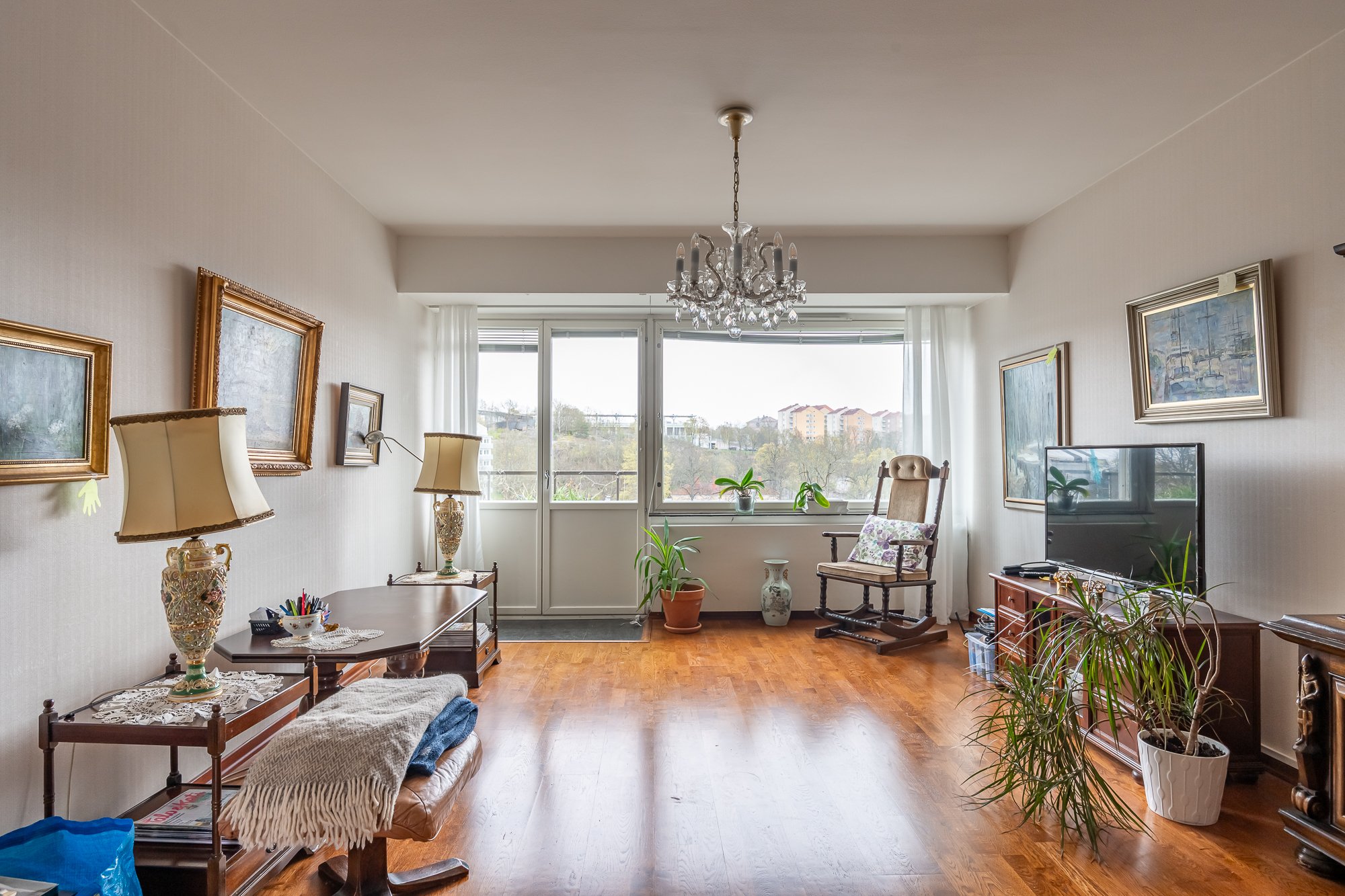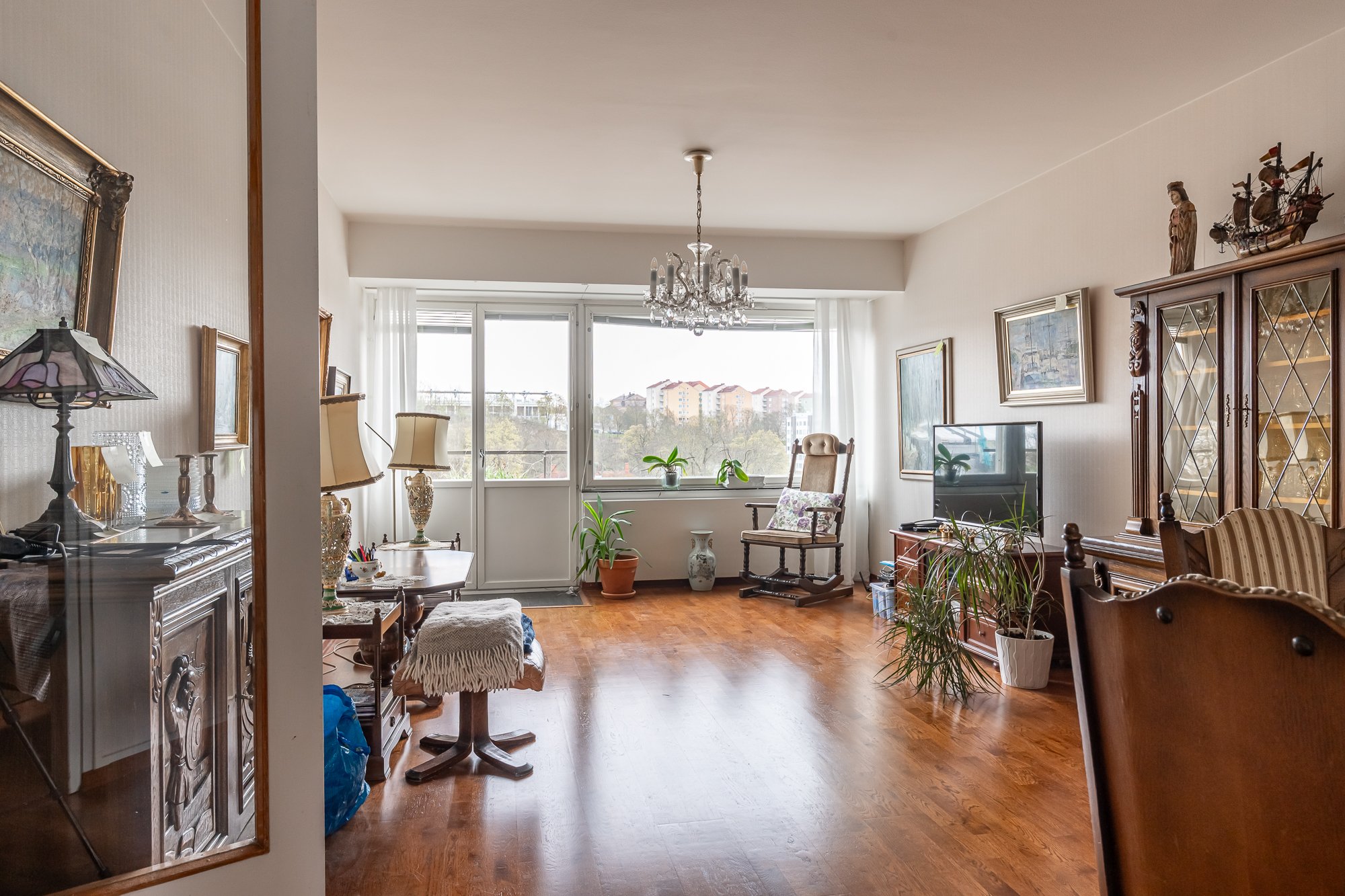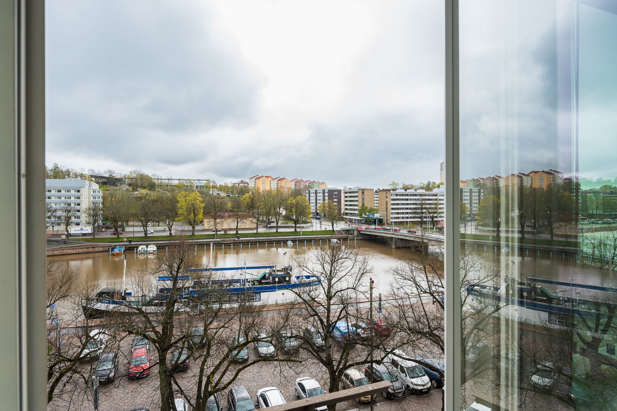 Valoisa iso olohuone. Ikkunasta ja ranskalaiselta parvekkeelta upeat näkymät Aurajoelle.