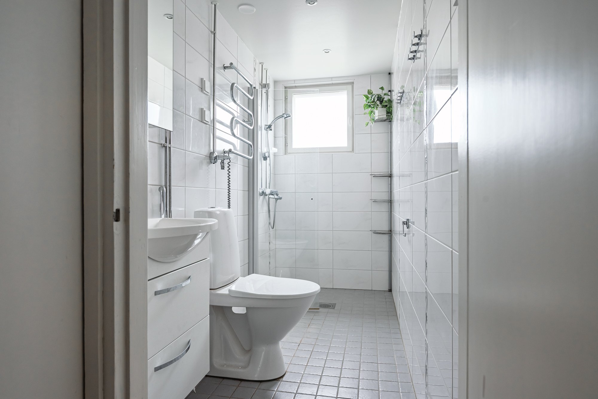 WC-istuin, suihku, suihkuseinä, pesukoneliitäntä, allaskaappi, peilikaappi, bidee-suihku ja pyyhekuivain