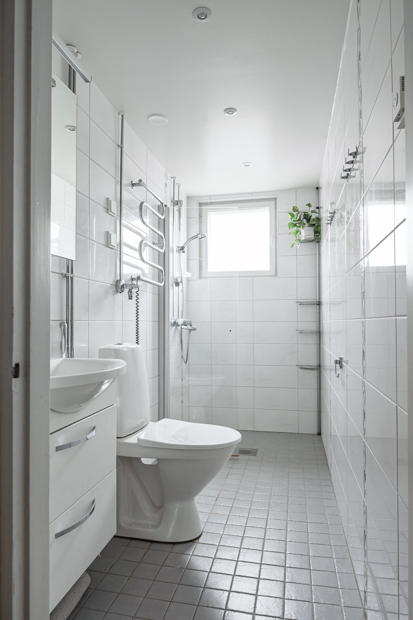 Taloyhtiön putkiremontin yhteydessä saneerattu vaaleasävyinen kylpyhuone ikkunalla.