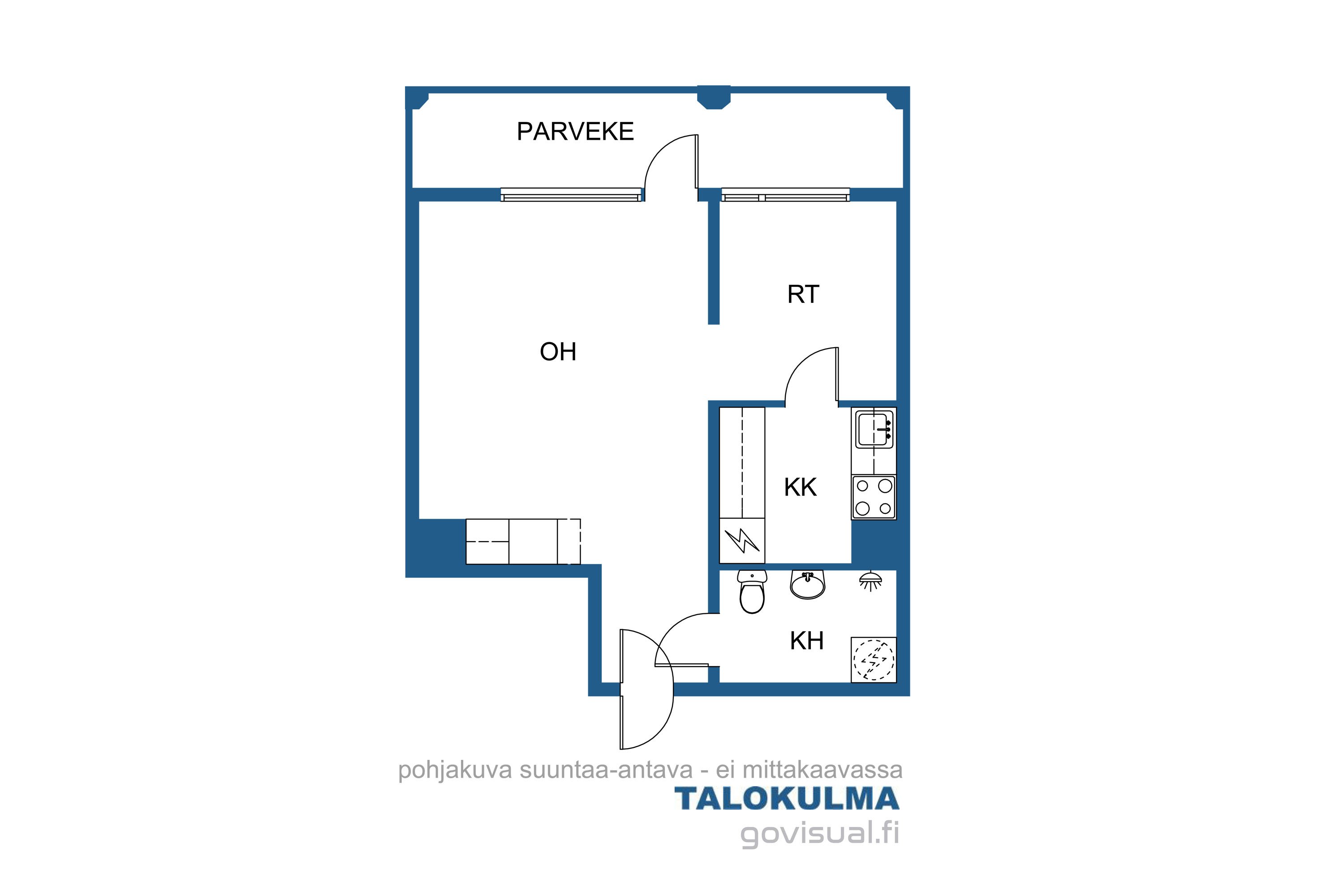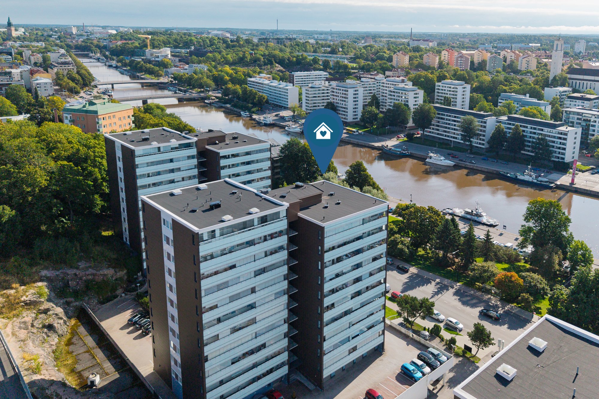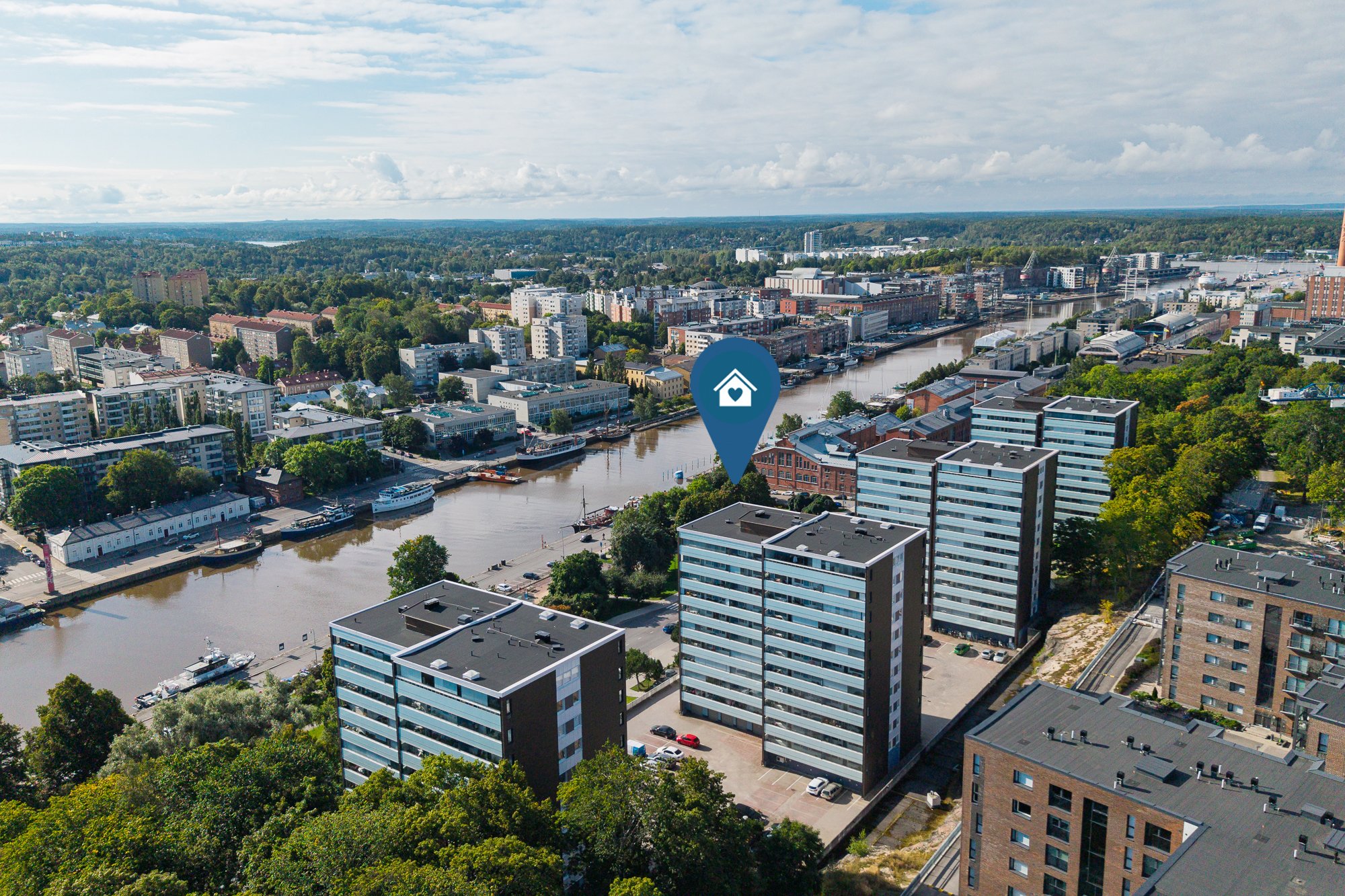 Asunnossa on avara huone josta on kulku huoneiston lasitetulle parvekkeelle. Parvekkeelta avautuvat näkymät Aurajoelle ja kaupungin suuntaan. Keittiöstä löytyy kaappi- ja laskutilaa. Pöytä mahtuu ikkunan ääreen helposti. Kylpyhuone on iso ja pesukone menee tilaan vaivatta.