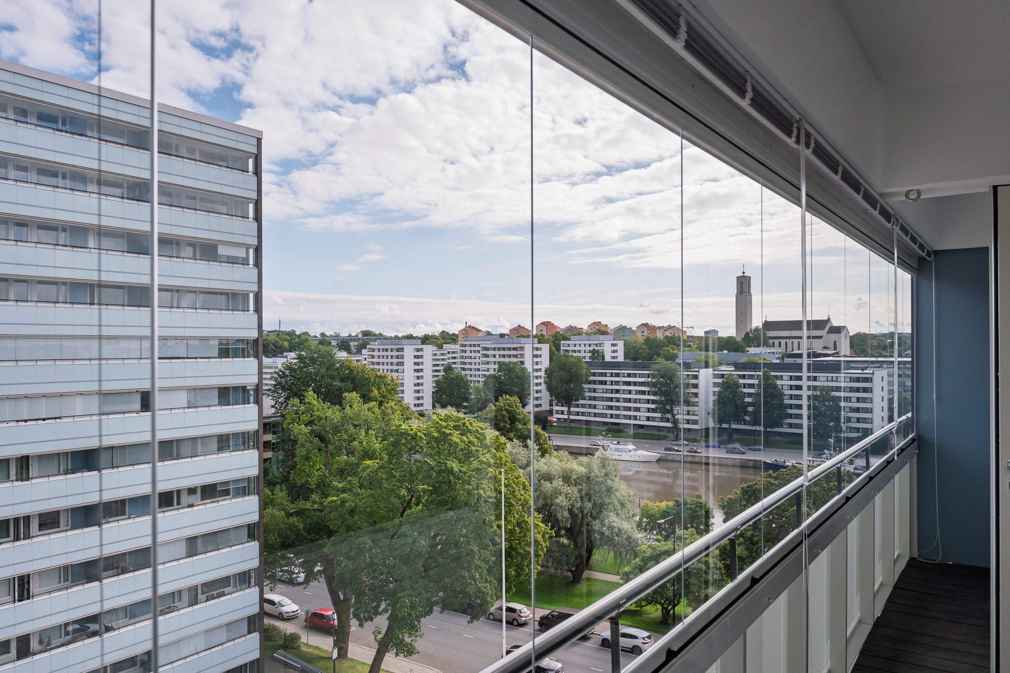 Huoneiston lasitetulta parvekkeelta näkymät Aurajoelle.