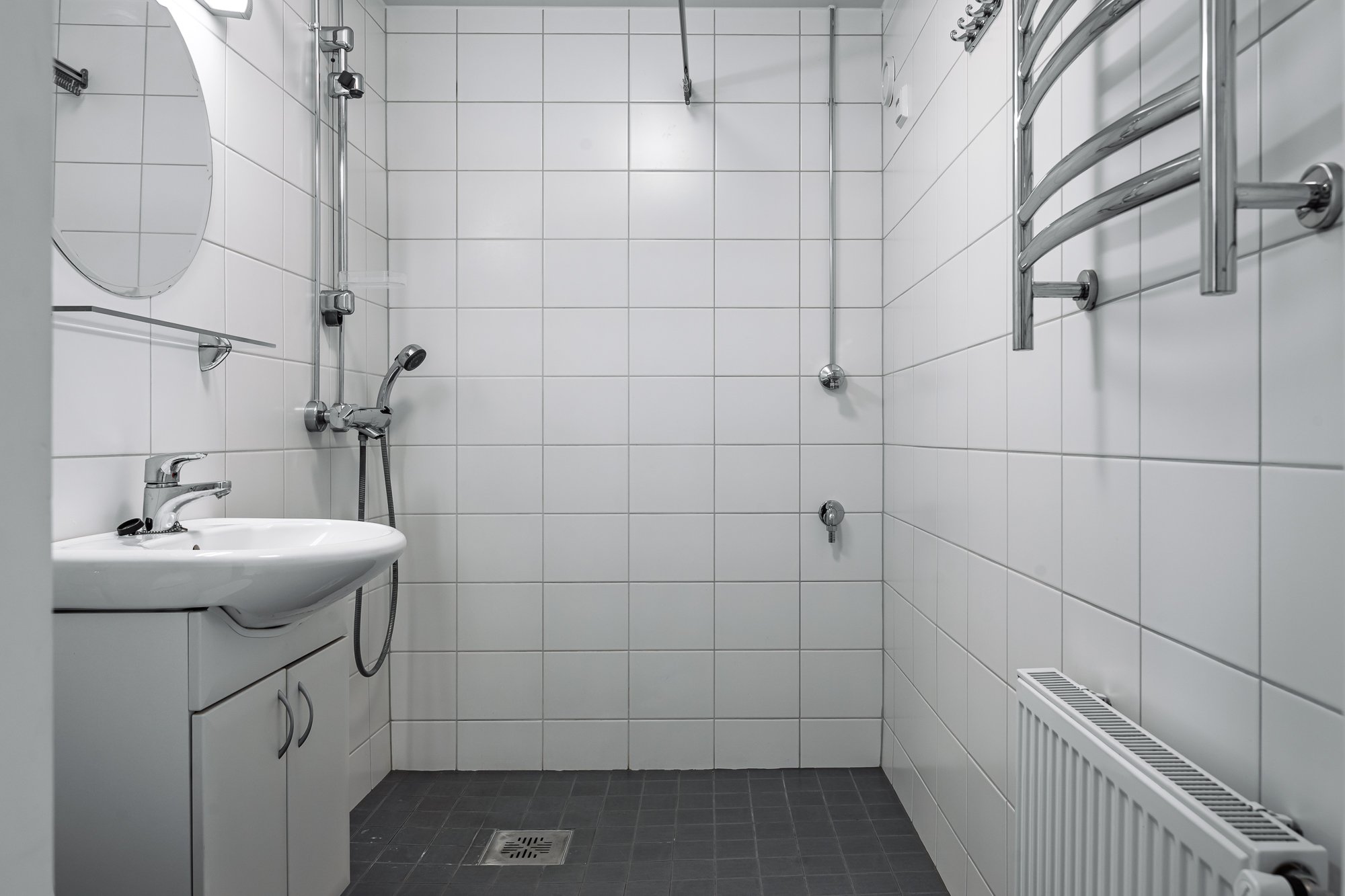 Tilava kylpyhuone remontoitu aikanaan putkiremontin yhteydessä. Pesukone mahtuu tilaan helposti.