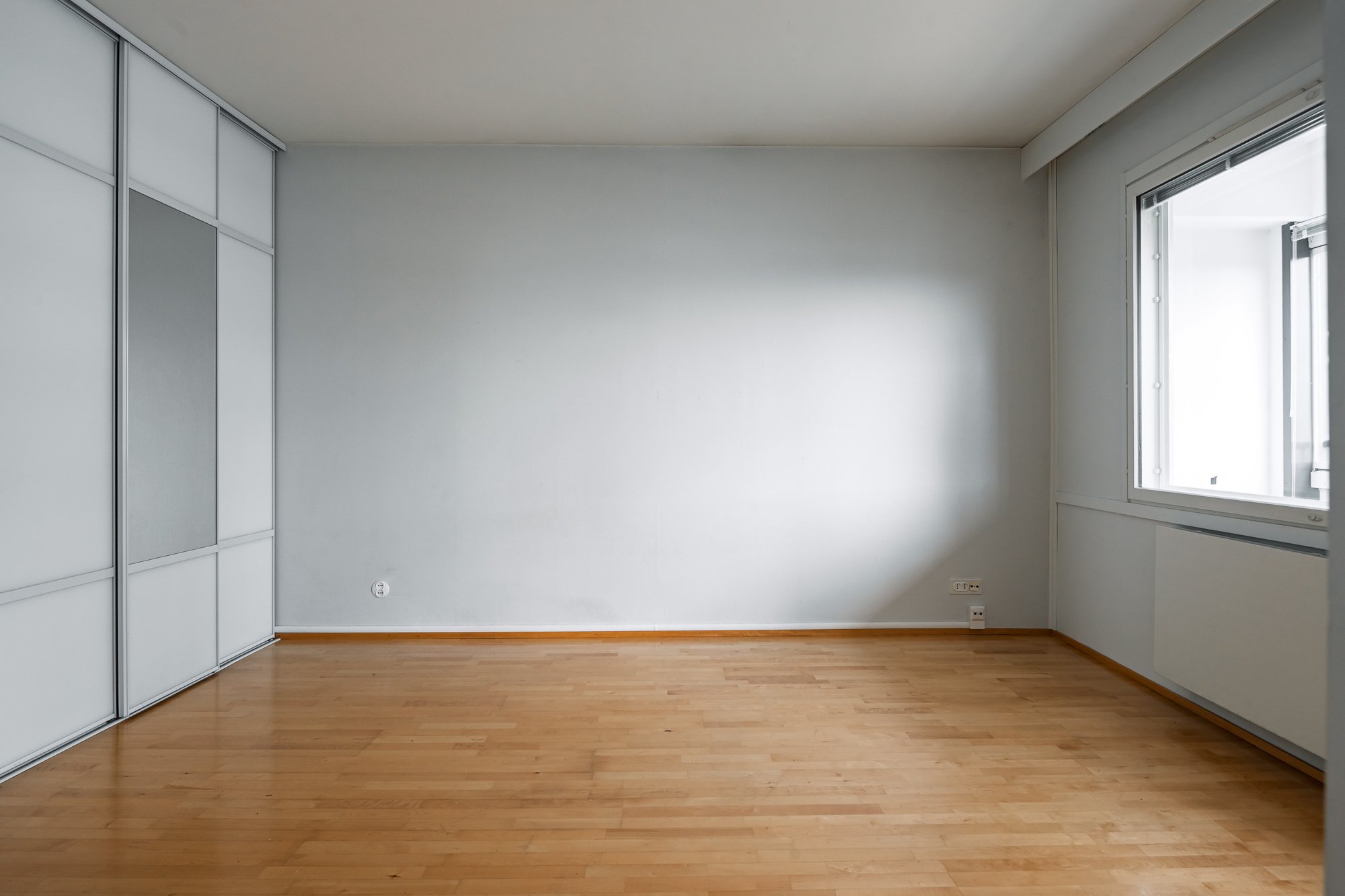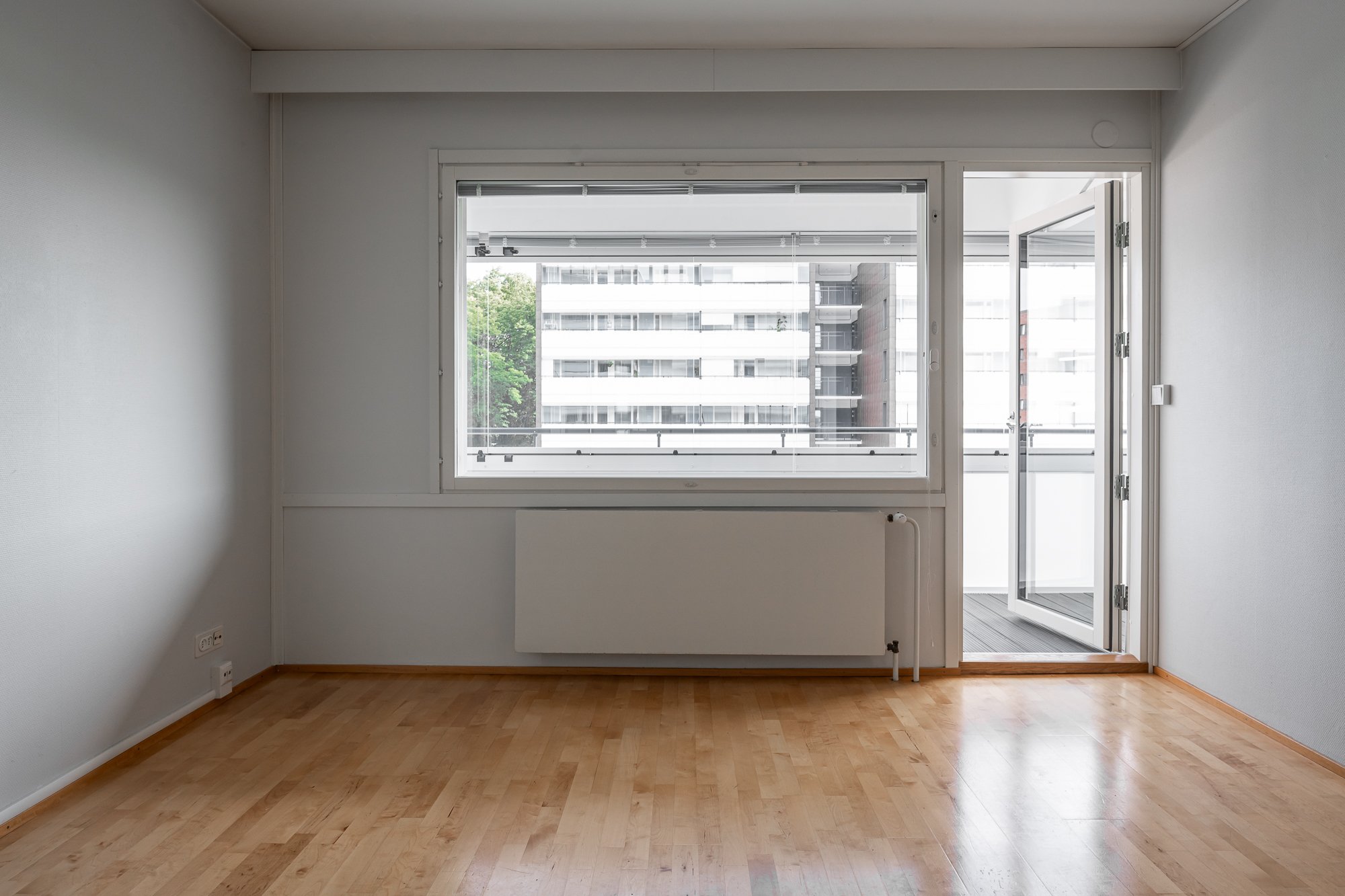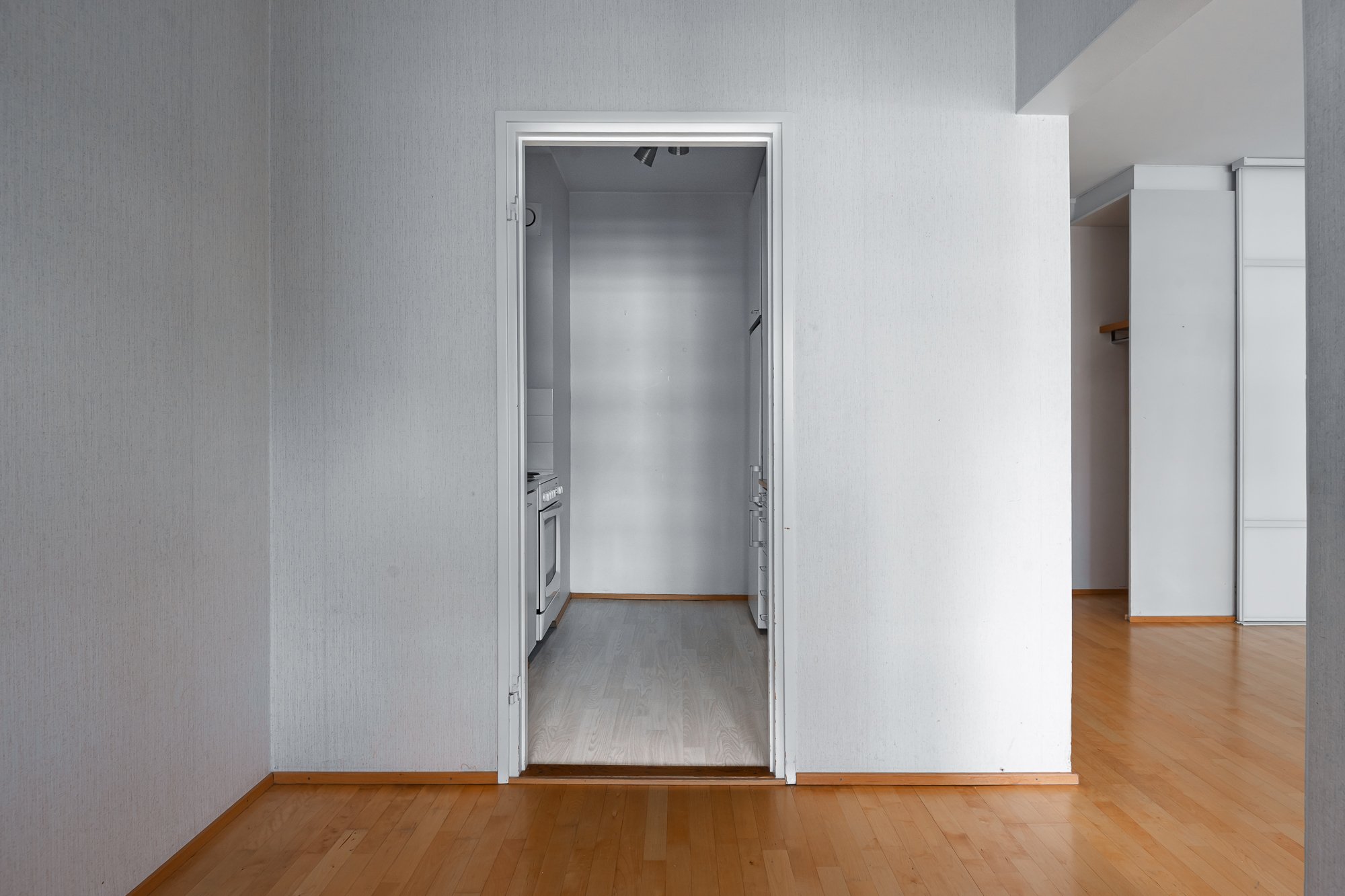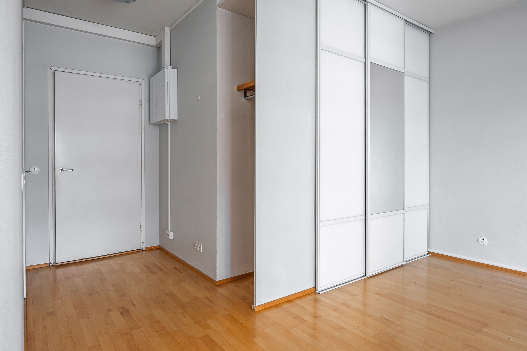 Avara huone jonka yhteydessä kaapistot. Huoneesta kulku huoneiston levyiselle lasitetulle parvekkeelle.