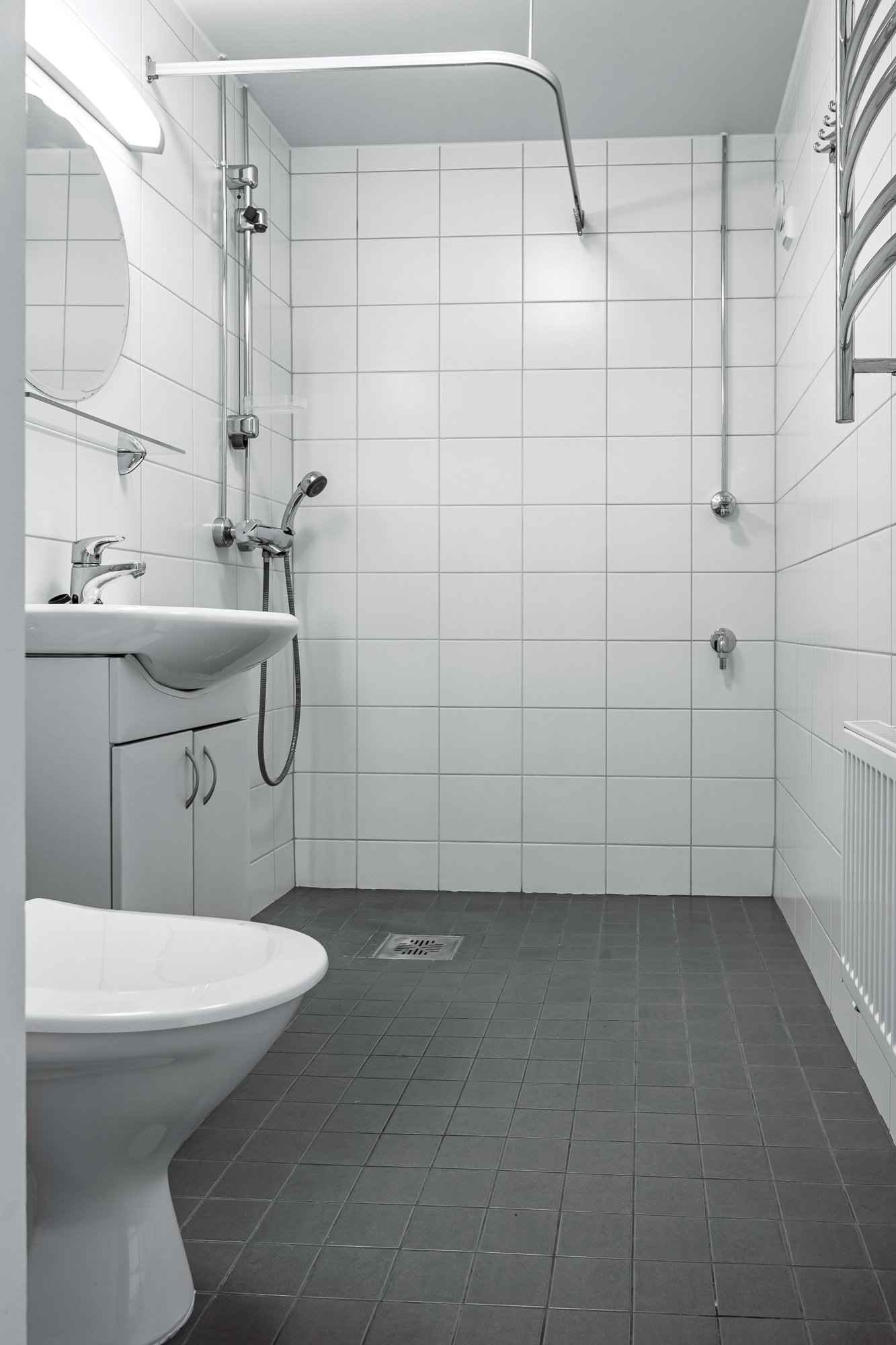 WC-istuin, suihku, pesukoneliitäntä, allaskaappi ja peili