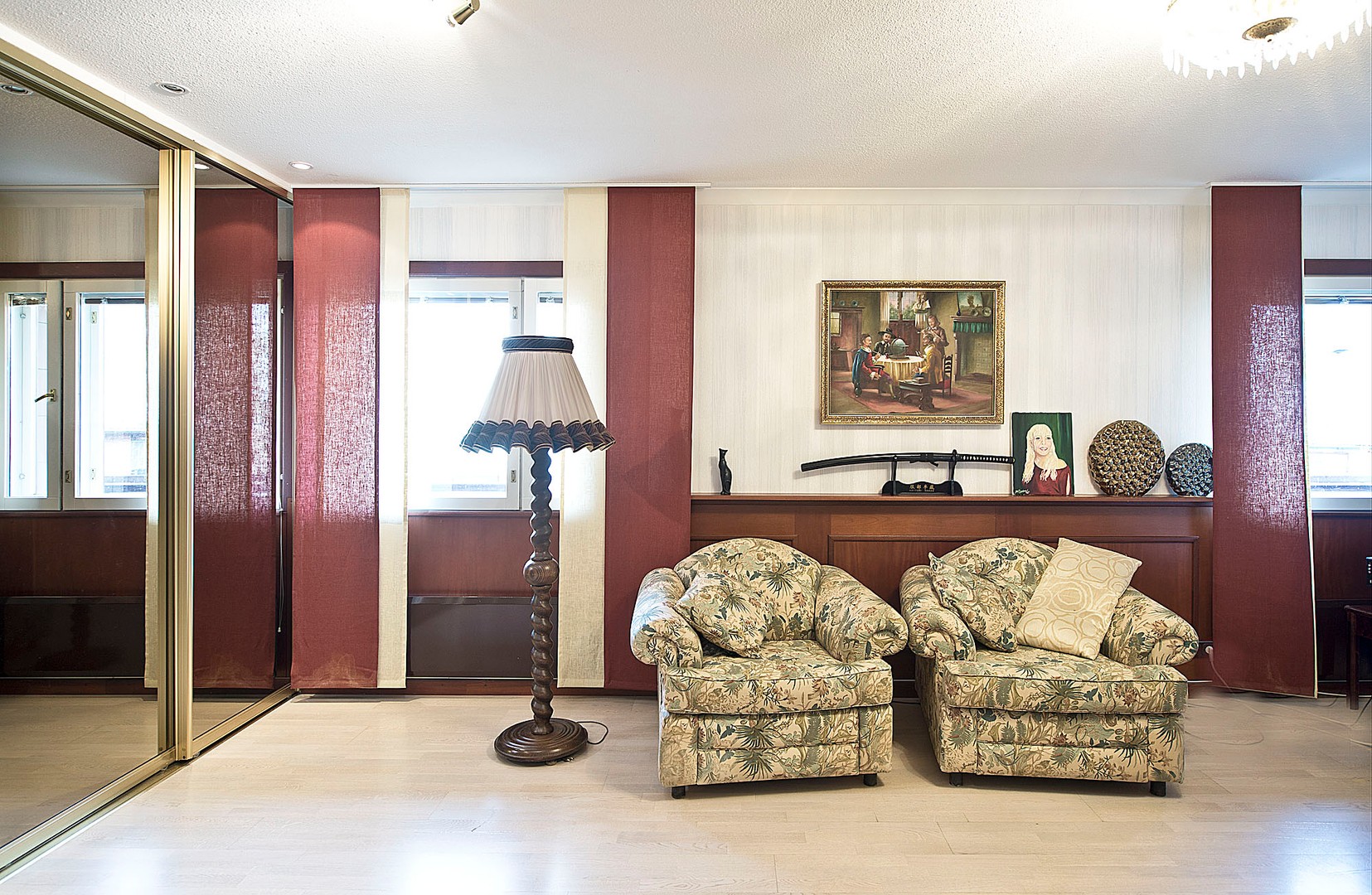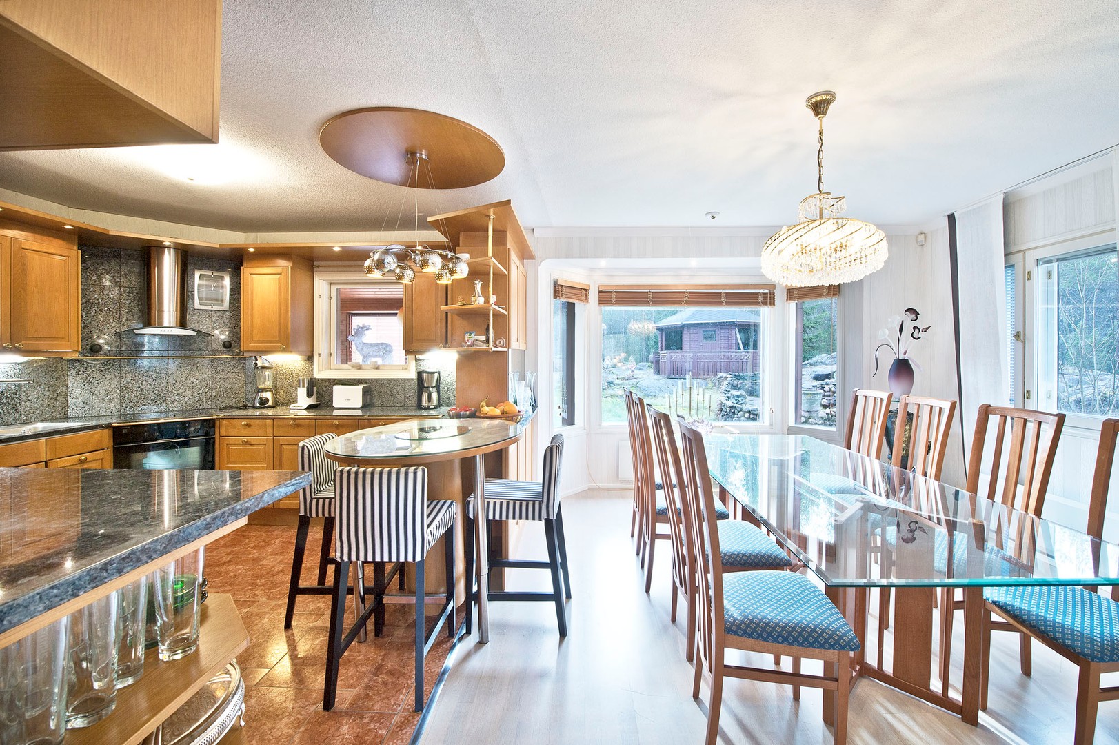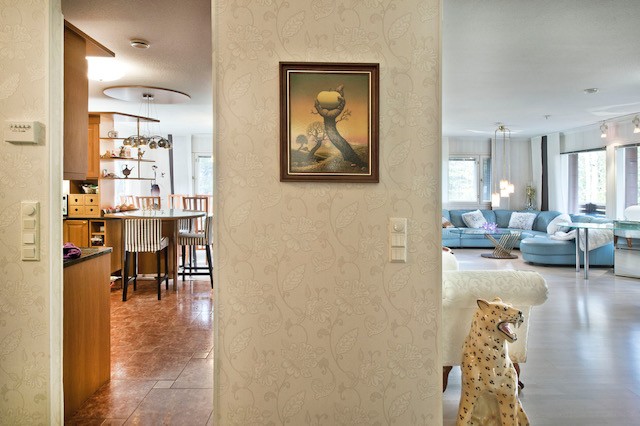 Iso ja avara olohuone jonka yhteydessä ruokahuone.