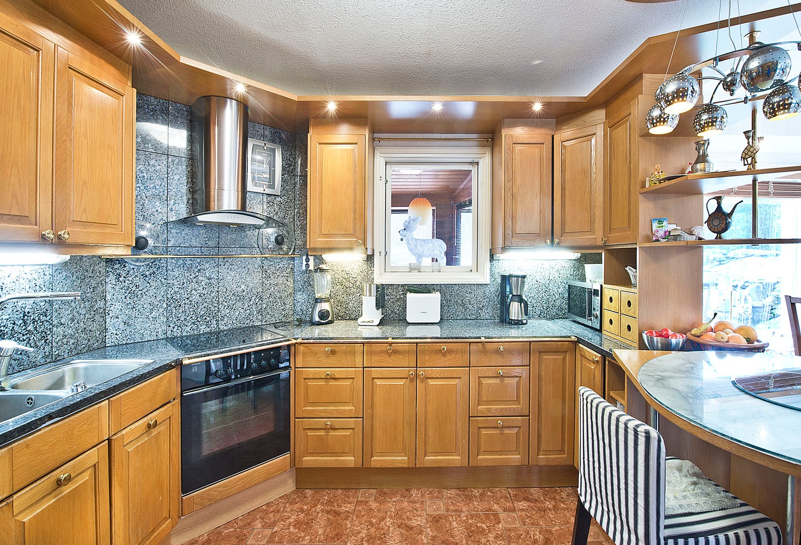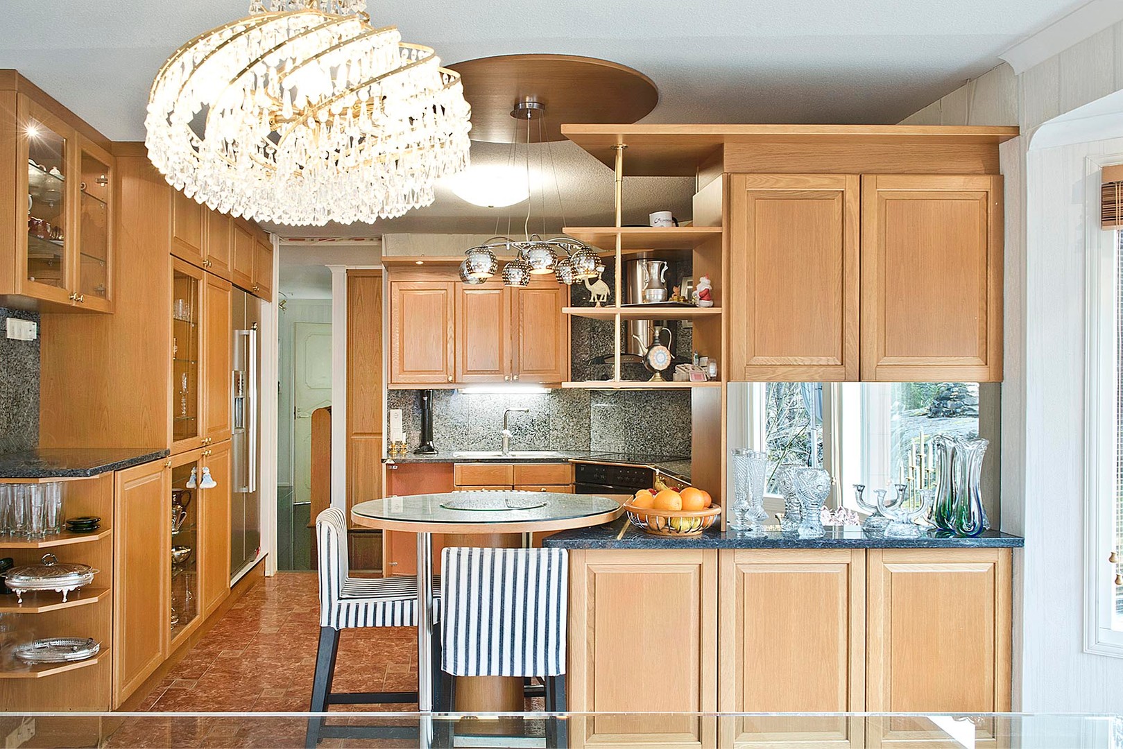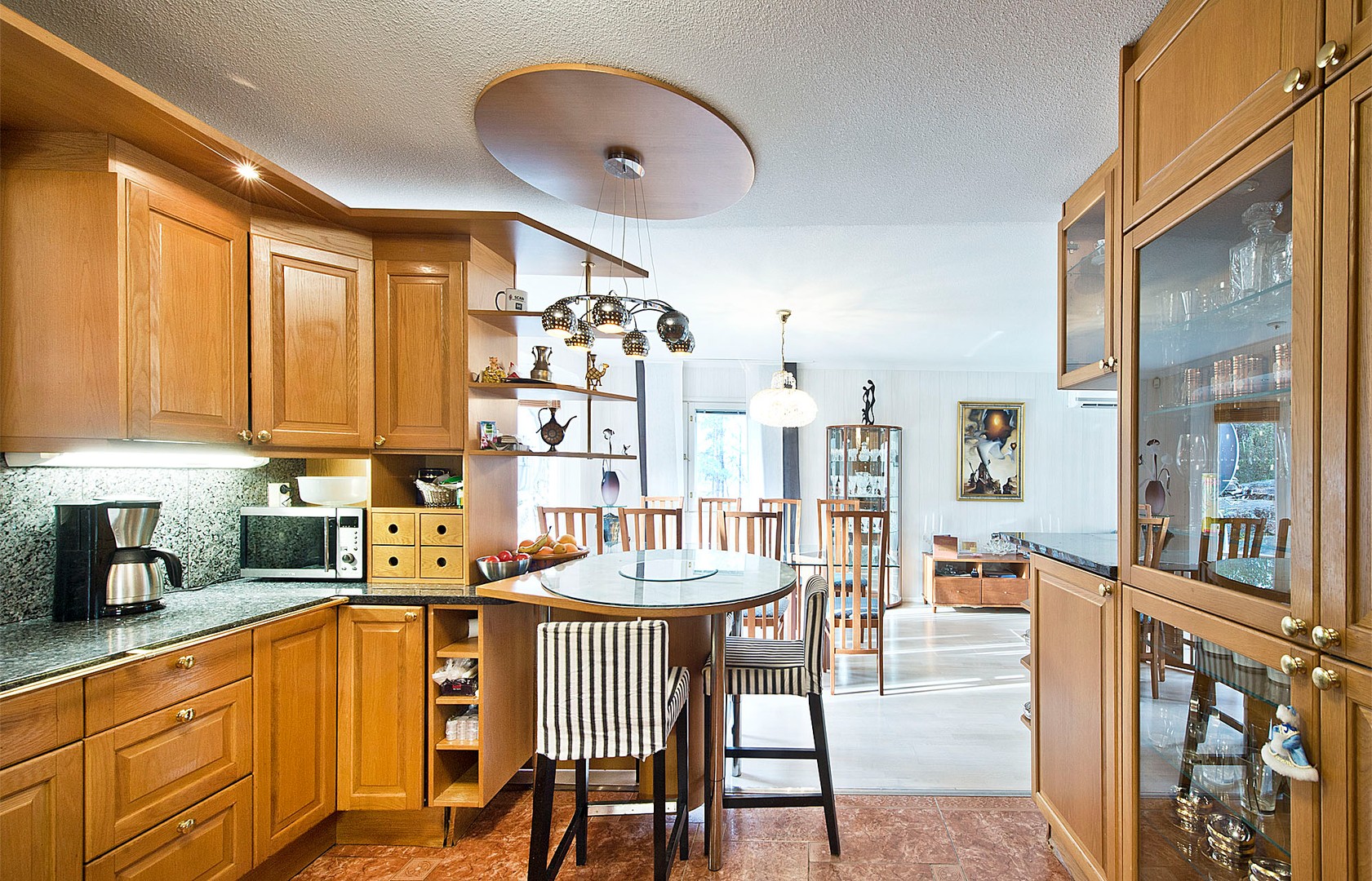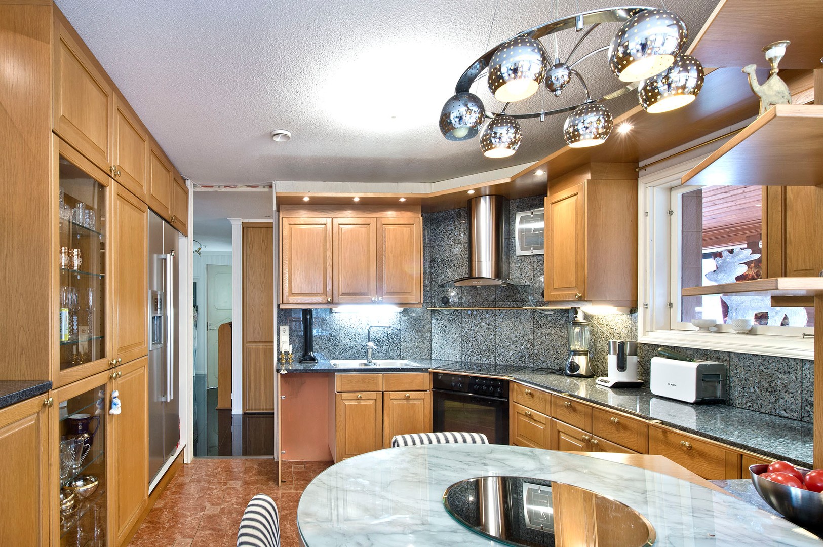 Tyylikäs ja tilava keittiö jossa reilusti kaappi- ja laskutilaa. Pöytä mahtuu ruokahuoneen puolelle. Keittiöstä kulku eteiseen ja ruokahuoneen / olohuoneen suuntaan.