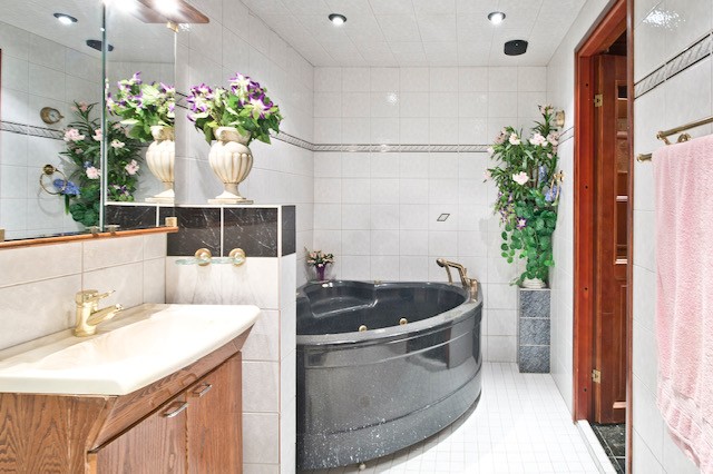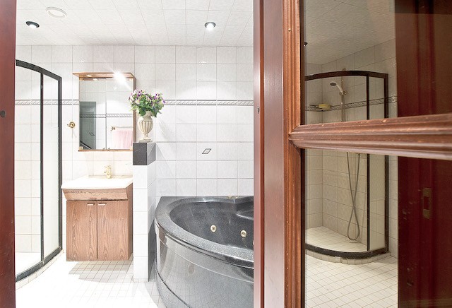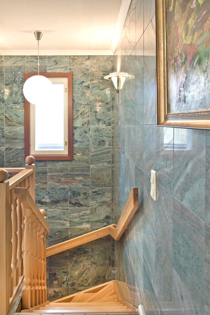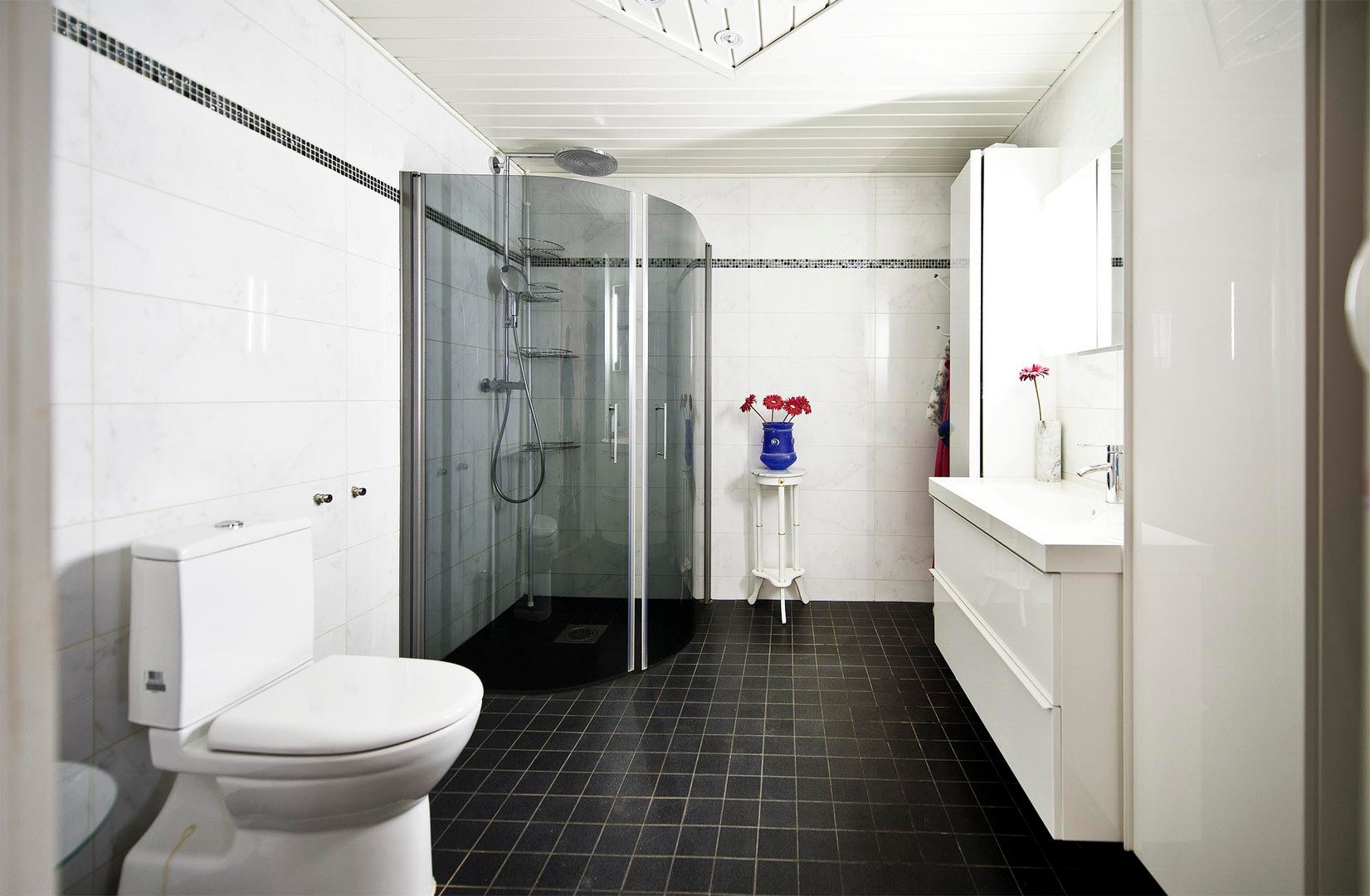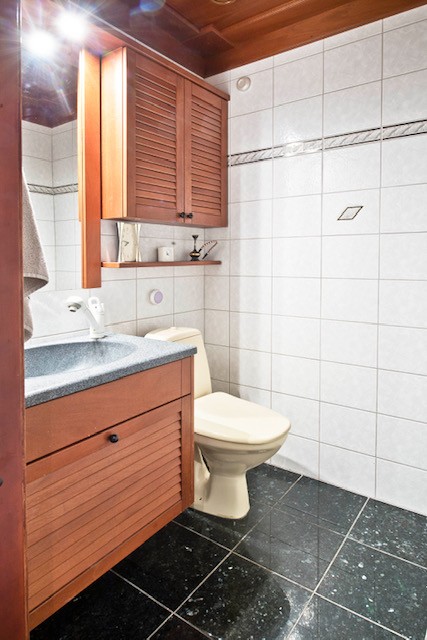 Yläkerrassa kylpyhuone jossa wc ja alakerrassa kylpyhuone sekä höyrysauna ja erillinen wc. Tiloissa lattialämmitys.
