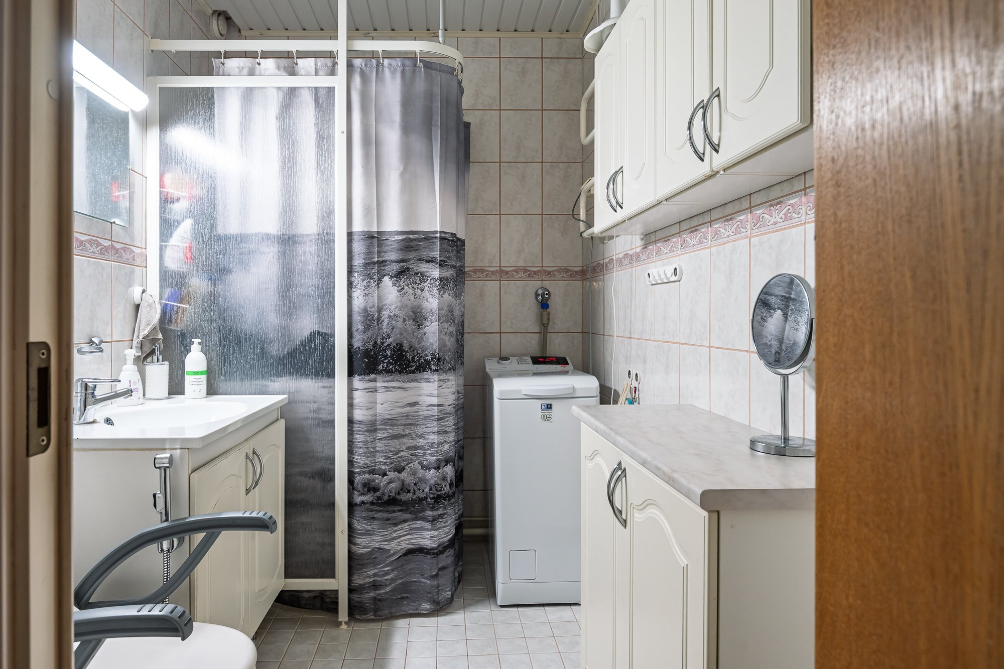 WC-istuin, suihku, allaskaappi, pesuallas ja bidee-suihku