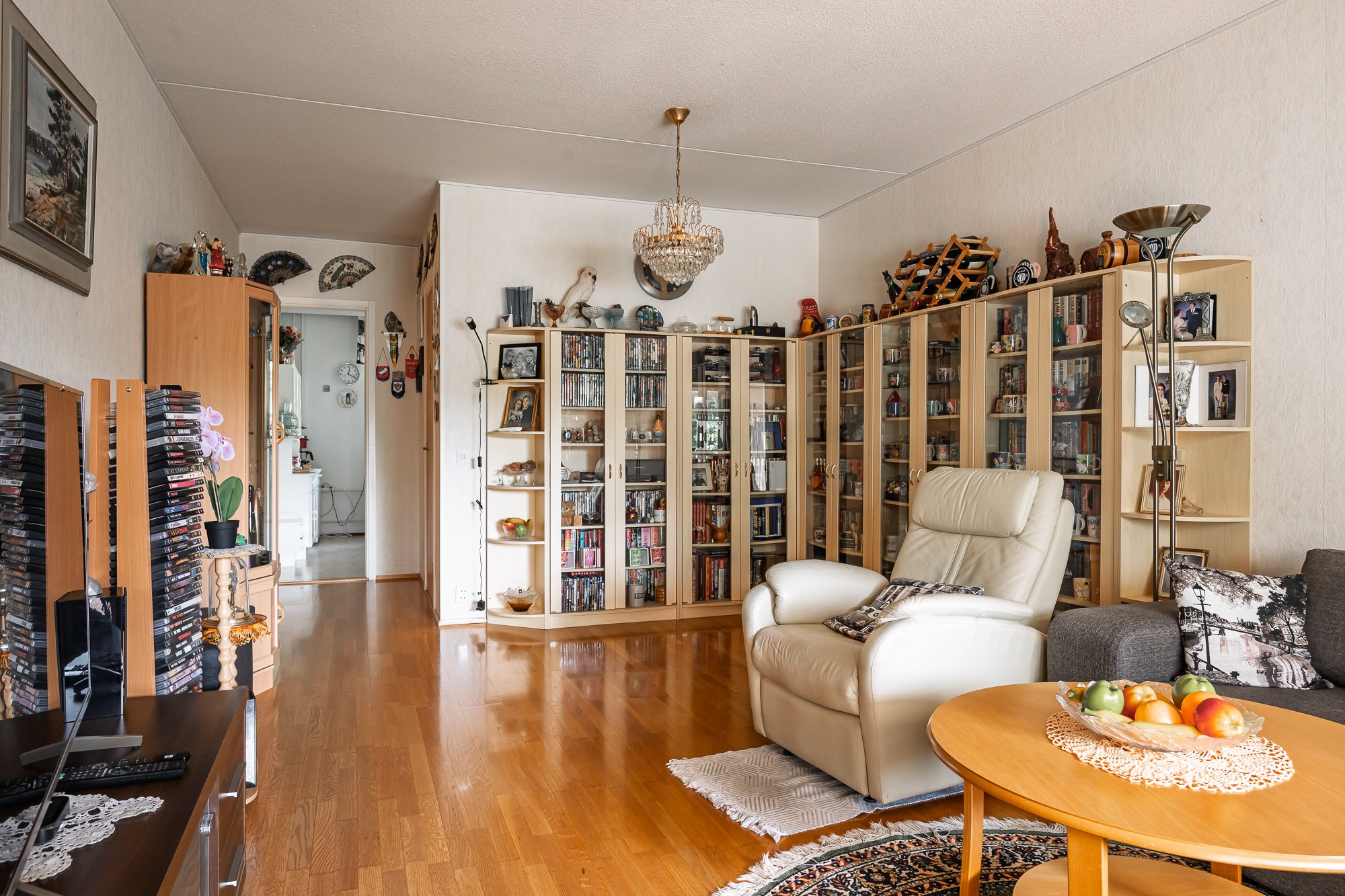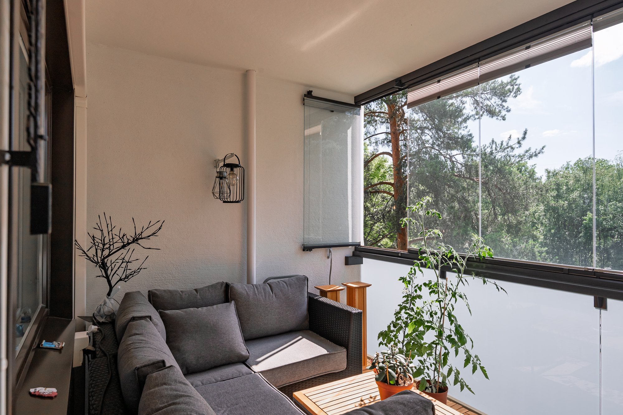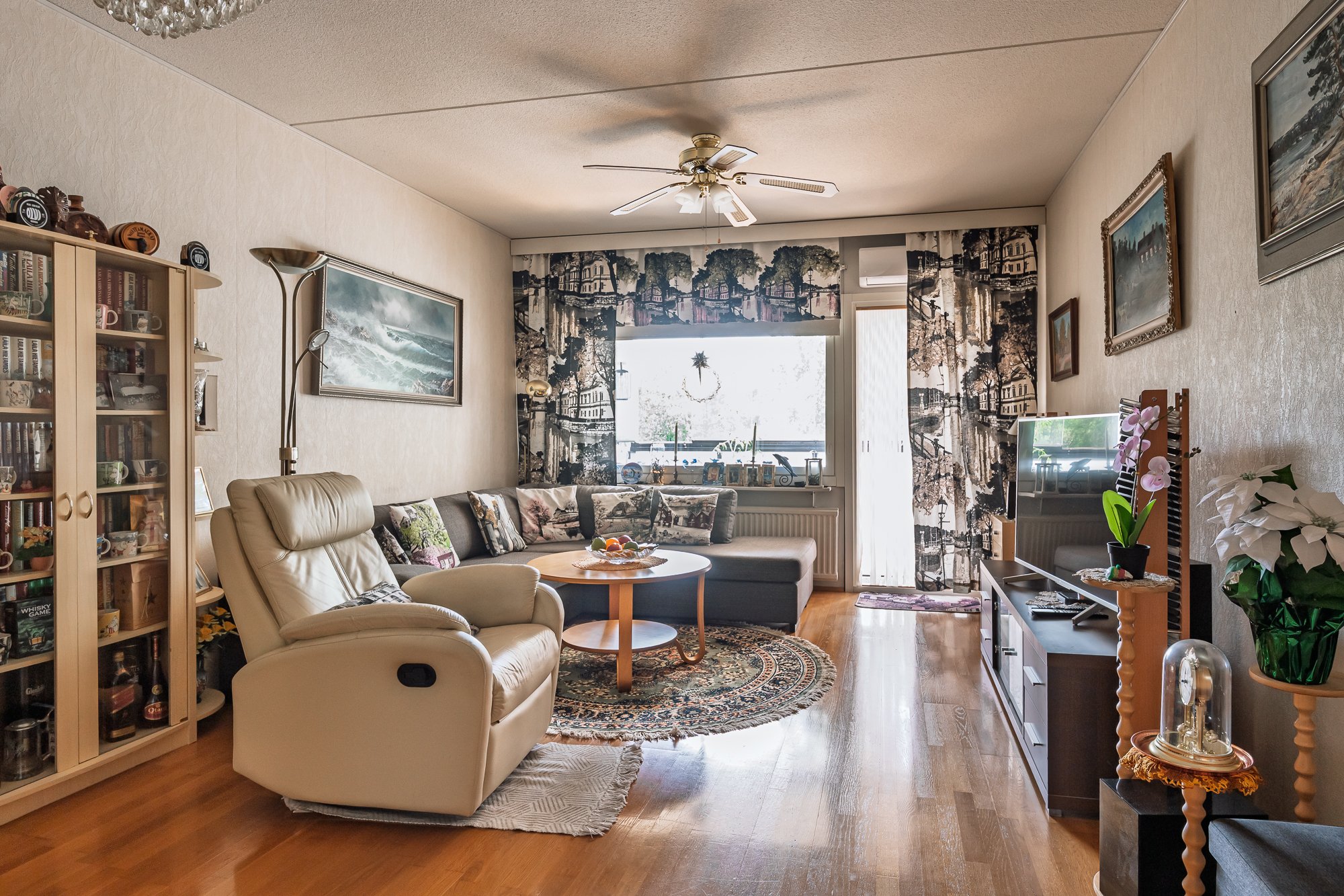 Valoisa ja tilava olohuone, kulku lasitetulle parvekkeelle