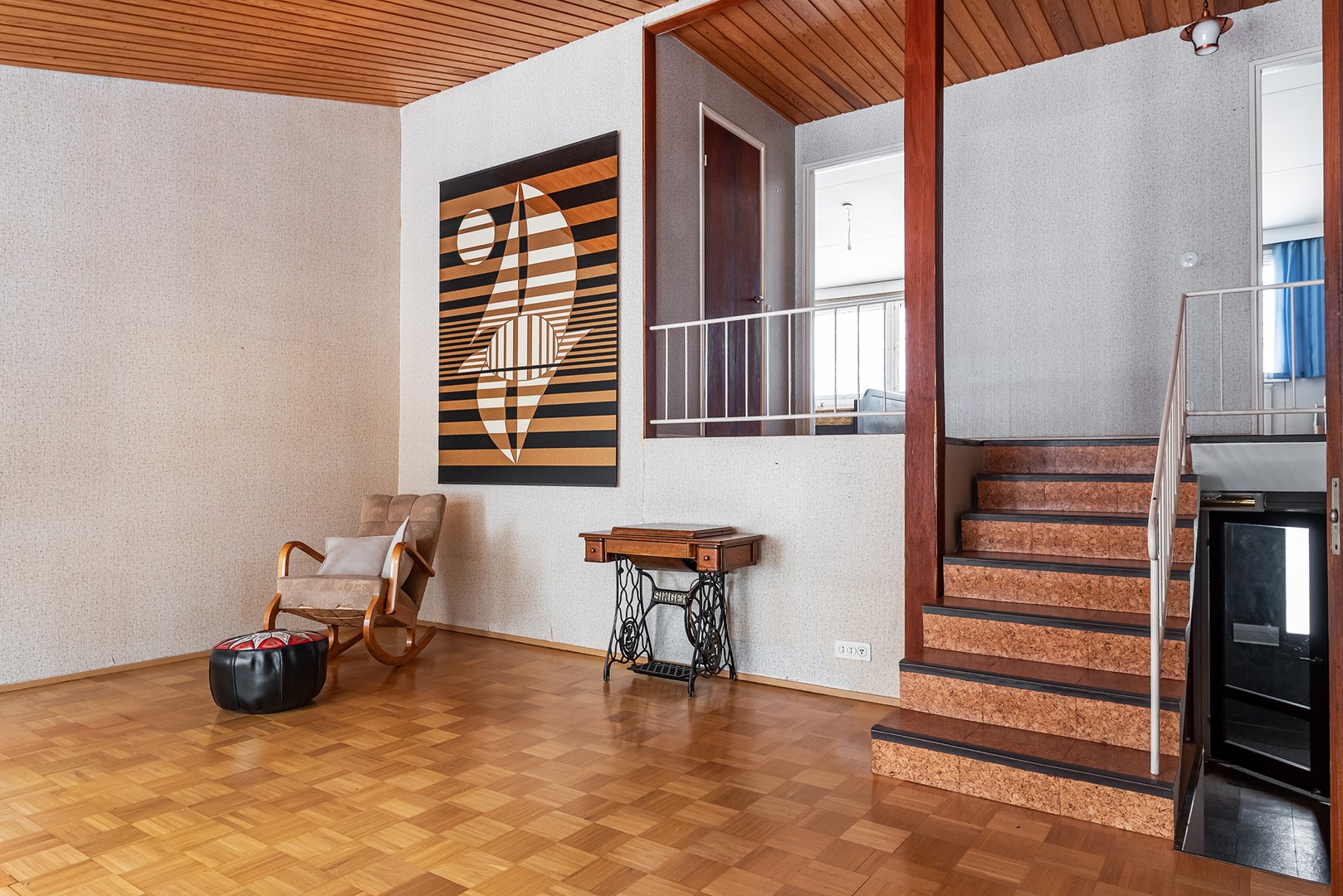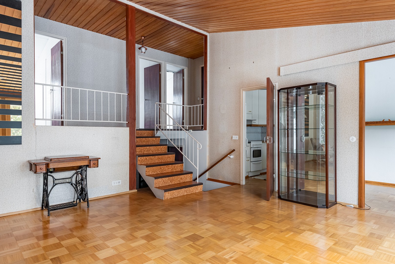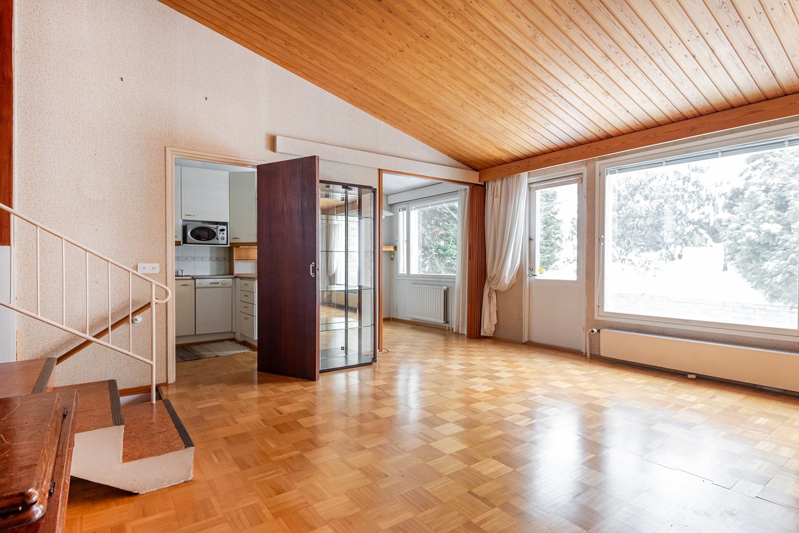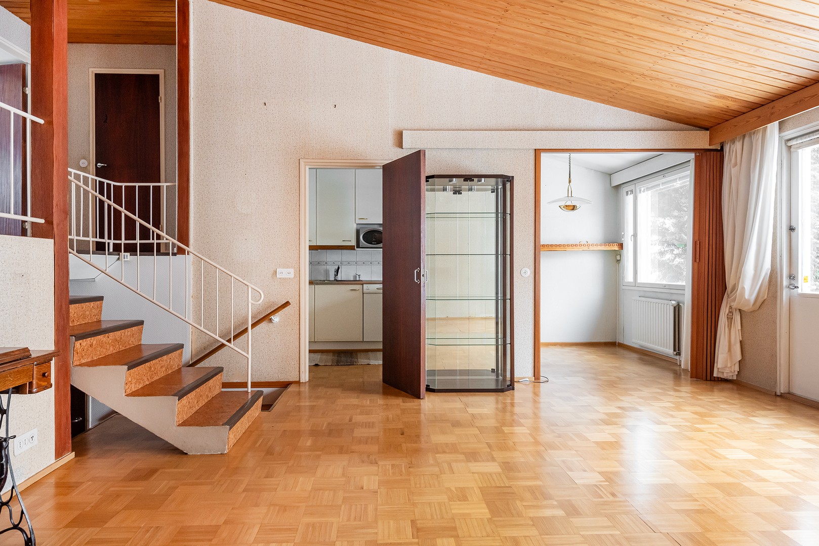 Asunto on porrastettu kolmeen eri tasoon. Muutamalla askelmalla pääsee eteisestä keskitasanteelle jossa sijaitsee huoneiston olohuone. Olohuone on avara ja vinokatto kohoaa lähes neljän metrin korkeuteen. Olohuoneen yhteydessä on huoneiston keittiö.