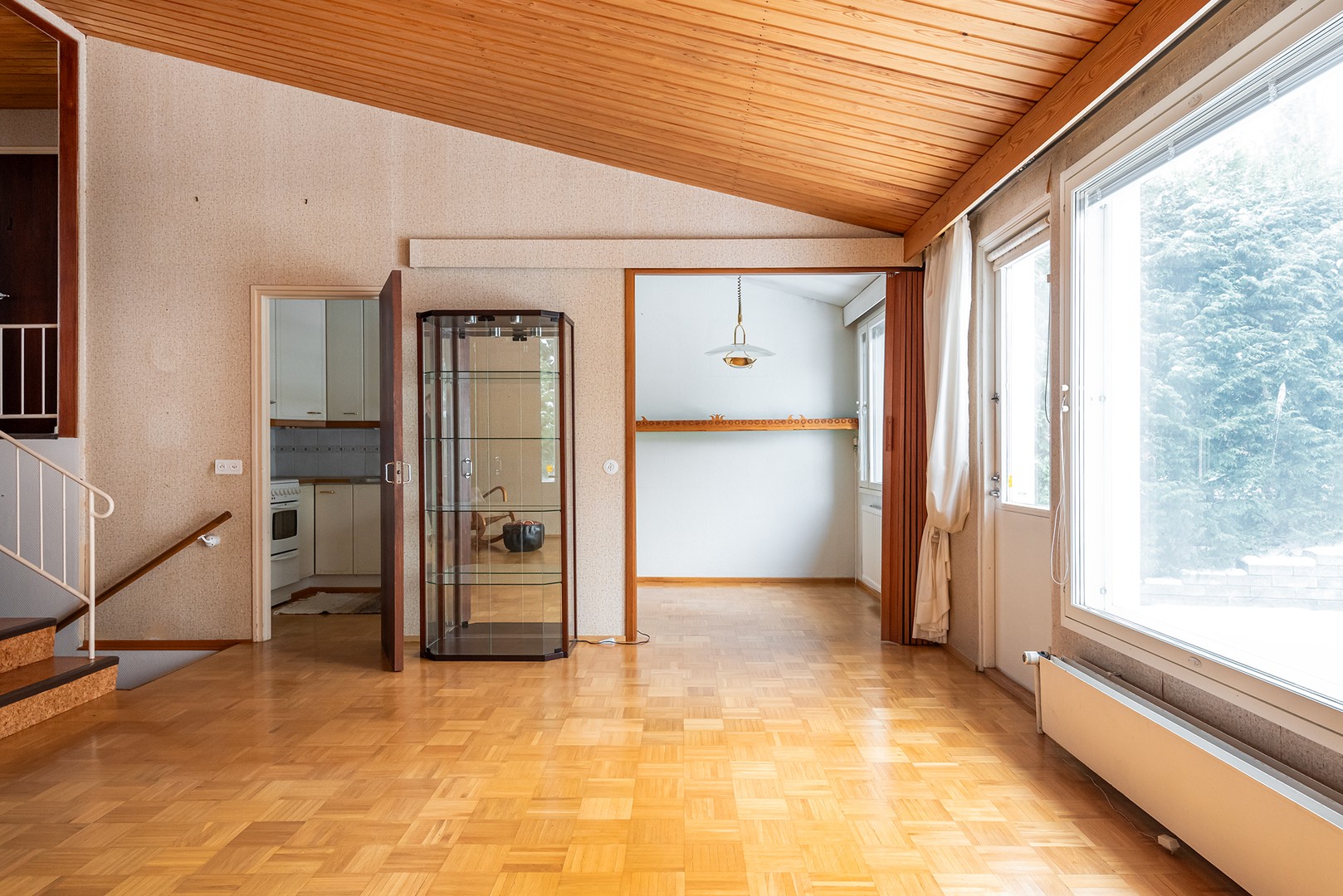 Iso ja avara olohuone josta kulku takapihalle, ala- ja yläkertaan sekä keittiöön. Osittain avattu tila yläkerran kanssa.