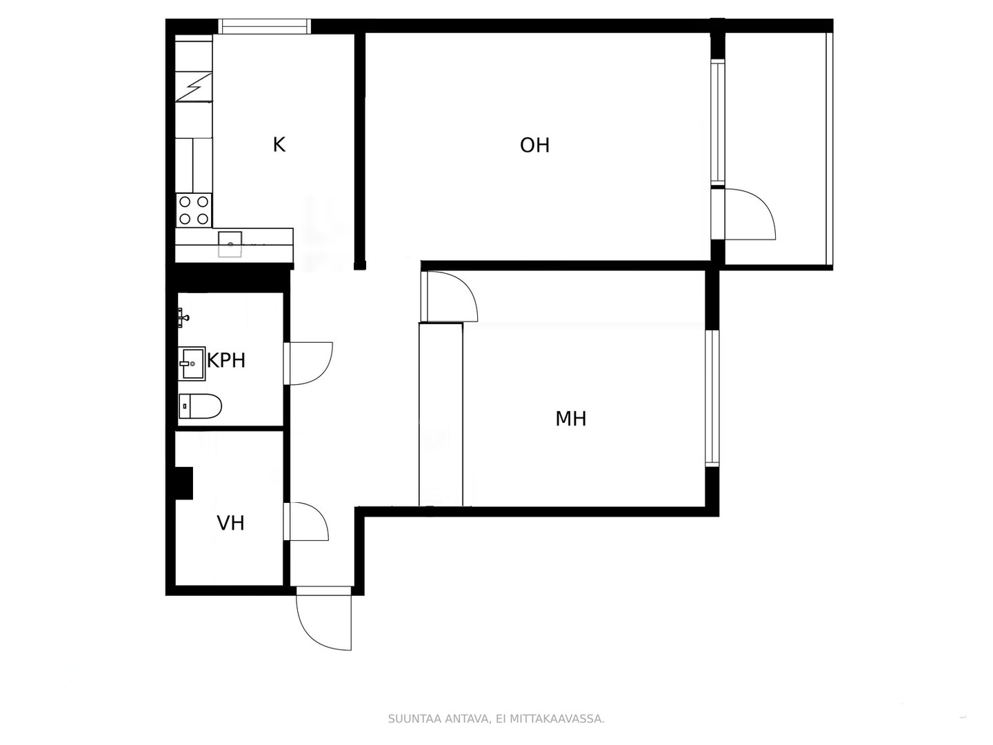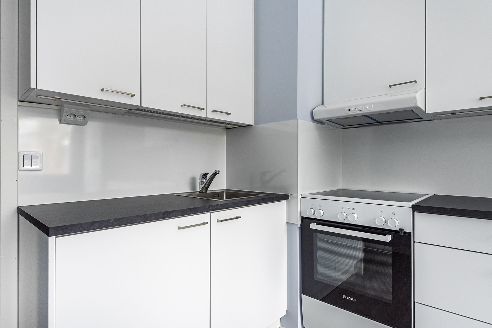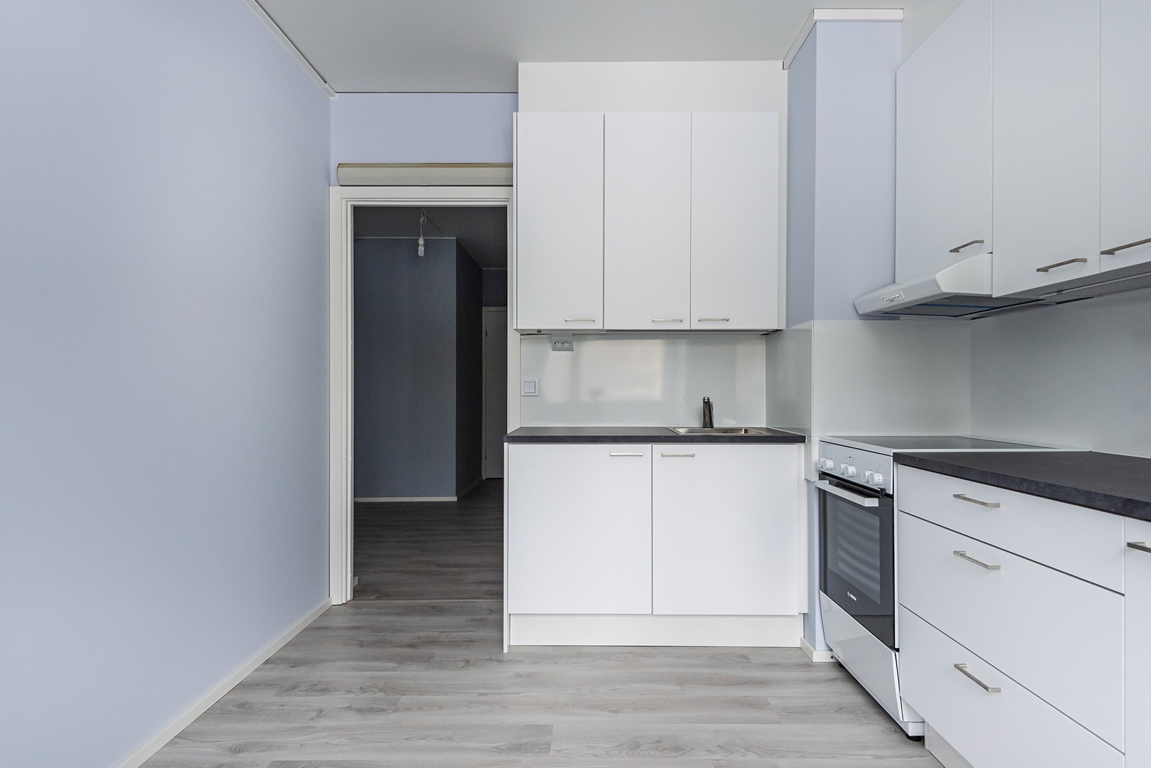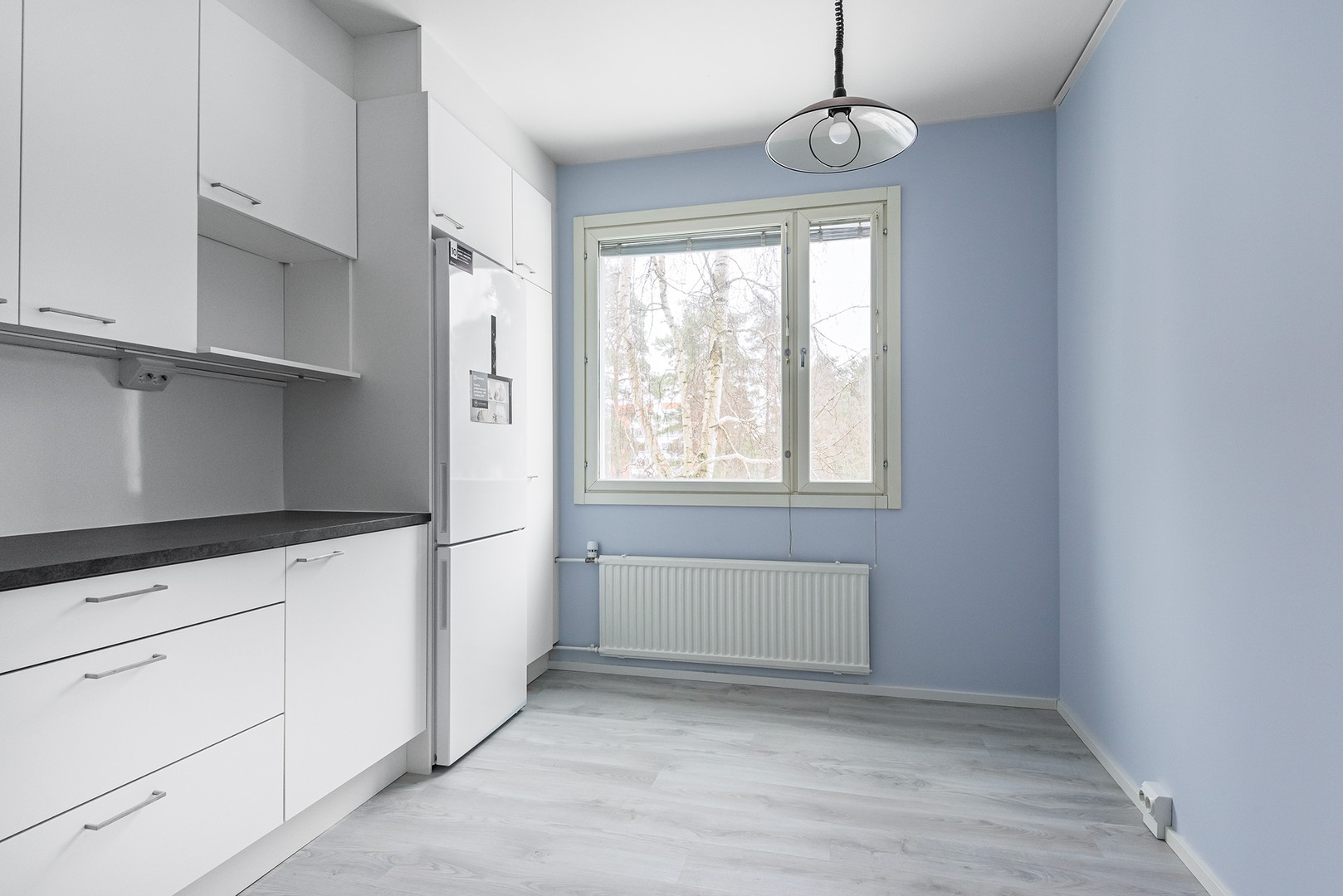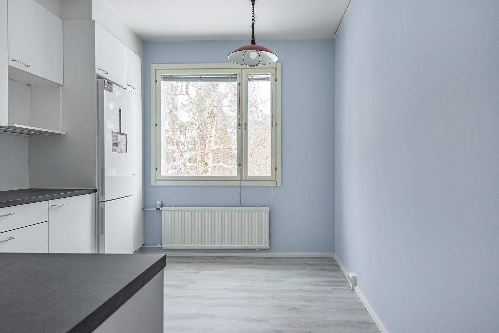Keittiö uusittu vuonna 2024. Kaappi- ja laskutilaa on reilusti. Ikkuna tuo tilaan valoa. Pöytä mahtuu ikkunan ääreen.