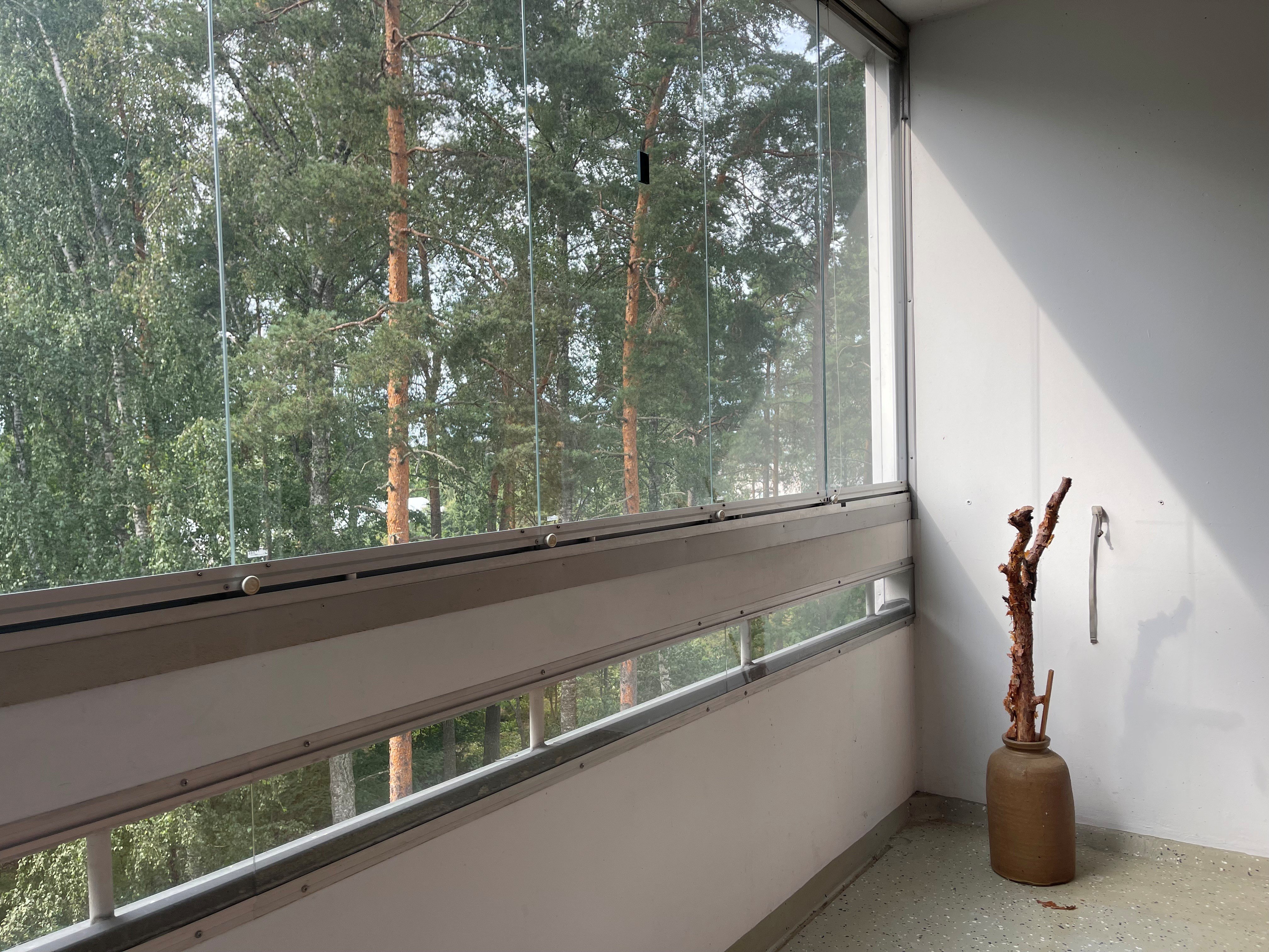 Remontoidun asunnon avarasta olohuoneesta on käynti auringon laskun suuntaan avautuvalle lasitetulle parvekkeelle.