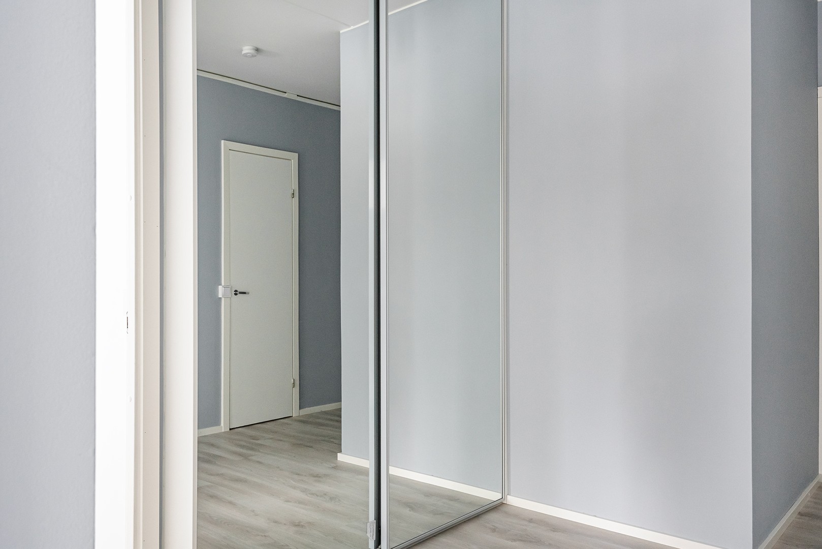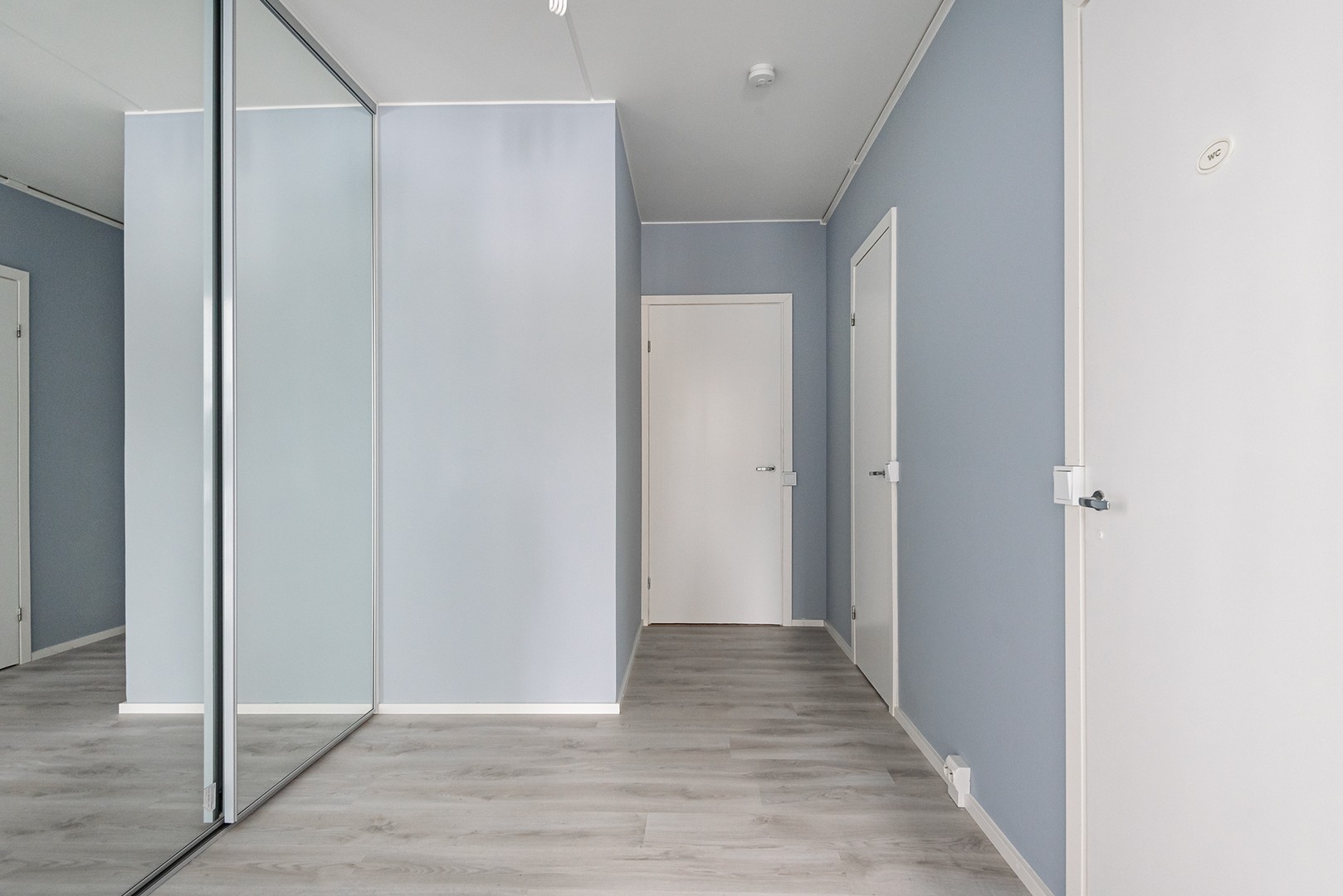 Tilavassa eteisessä ulkovaatteet ja kengät saa näppärästi piiloon isojen peiliovien kätköihin.