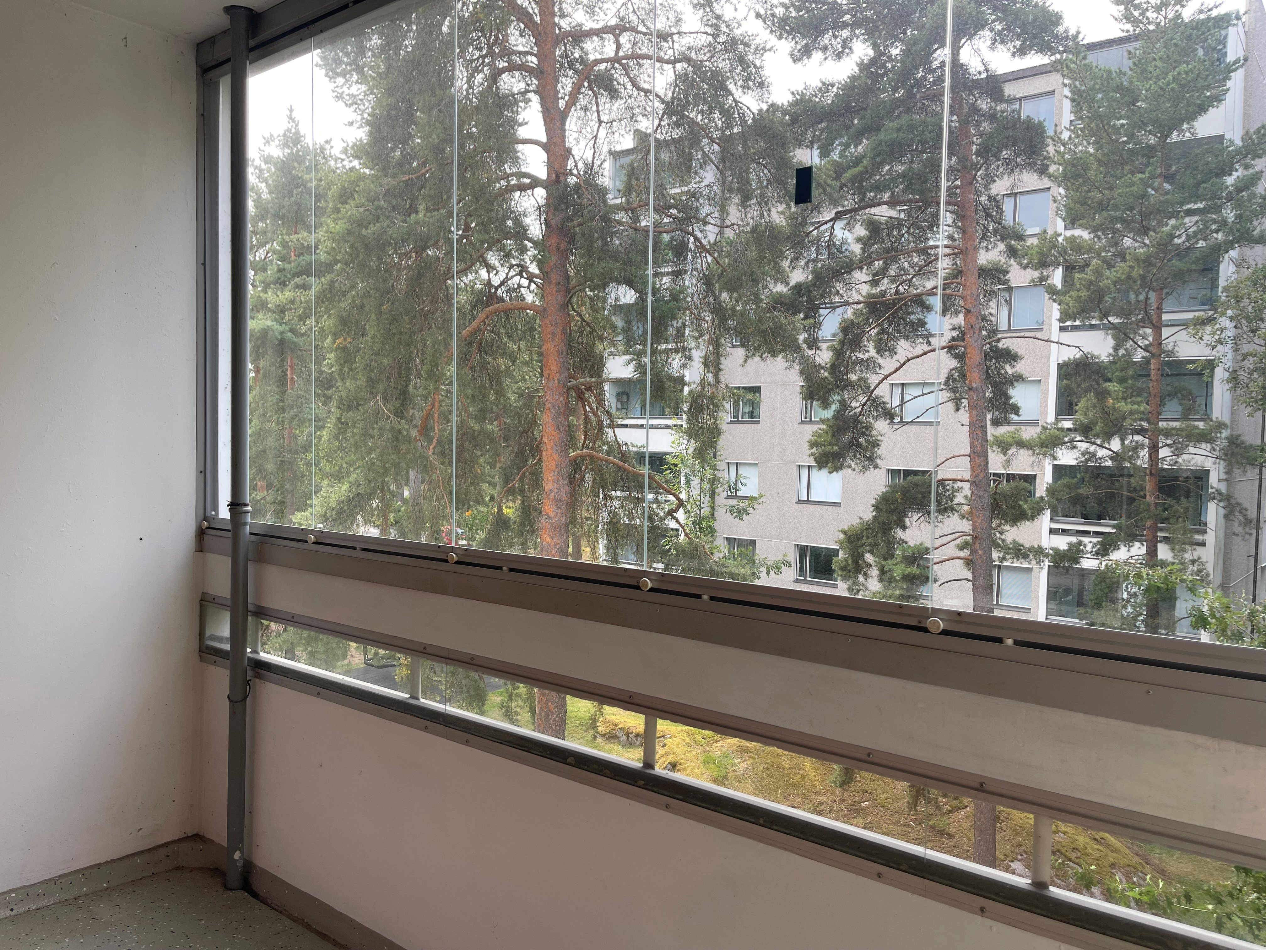 Iso ja avara olohuone josta kulku huoneiston lasitetulle parvekkeelle. Olohuoneen pinnat uusittu äskettäin.