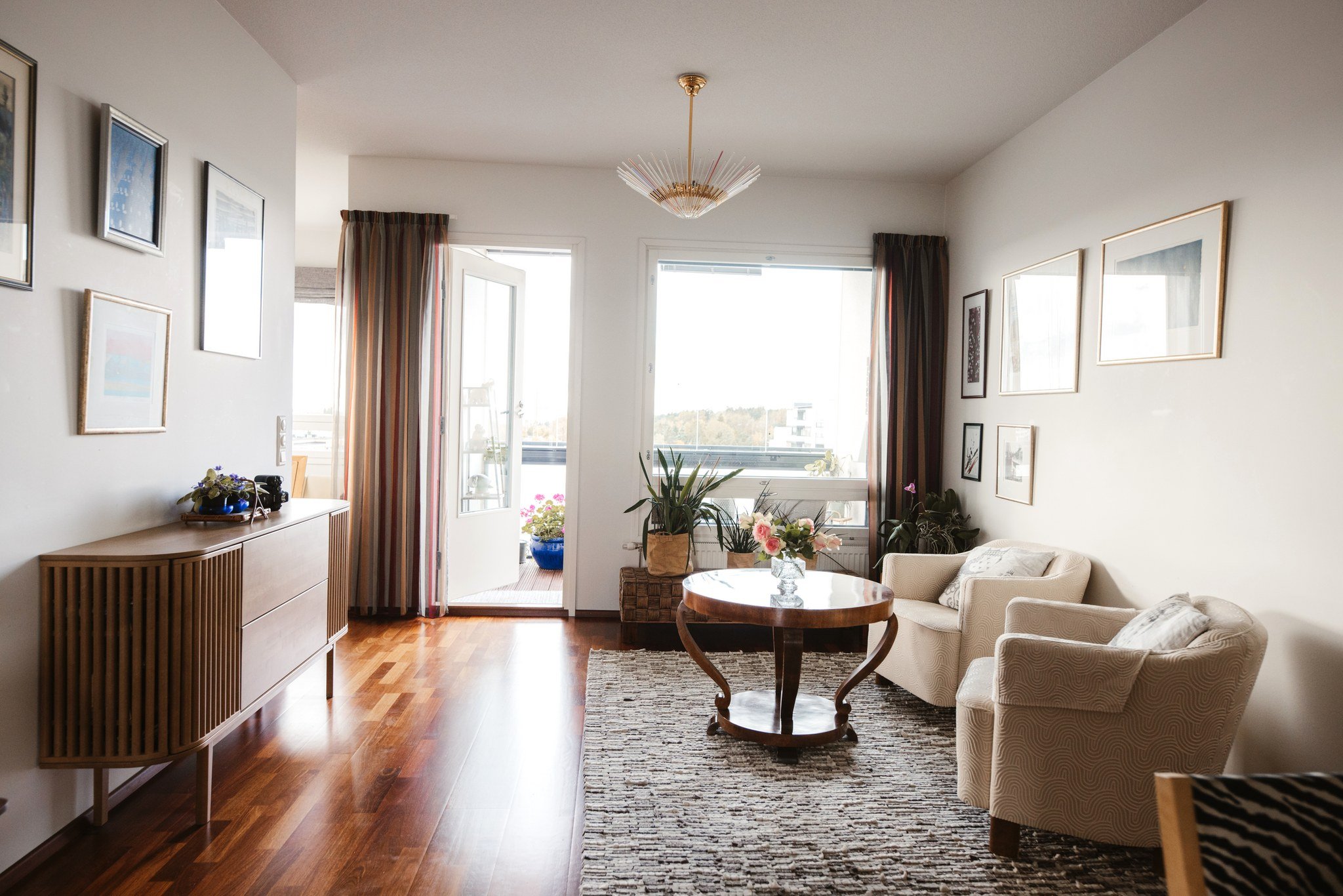 Avara olohuone josta kulku huoneiston lasitetulle parvekkeelle.