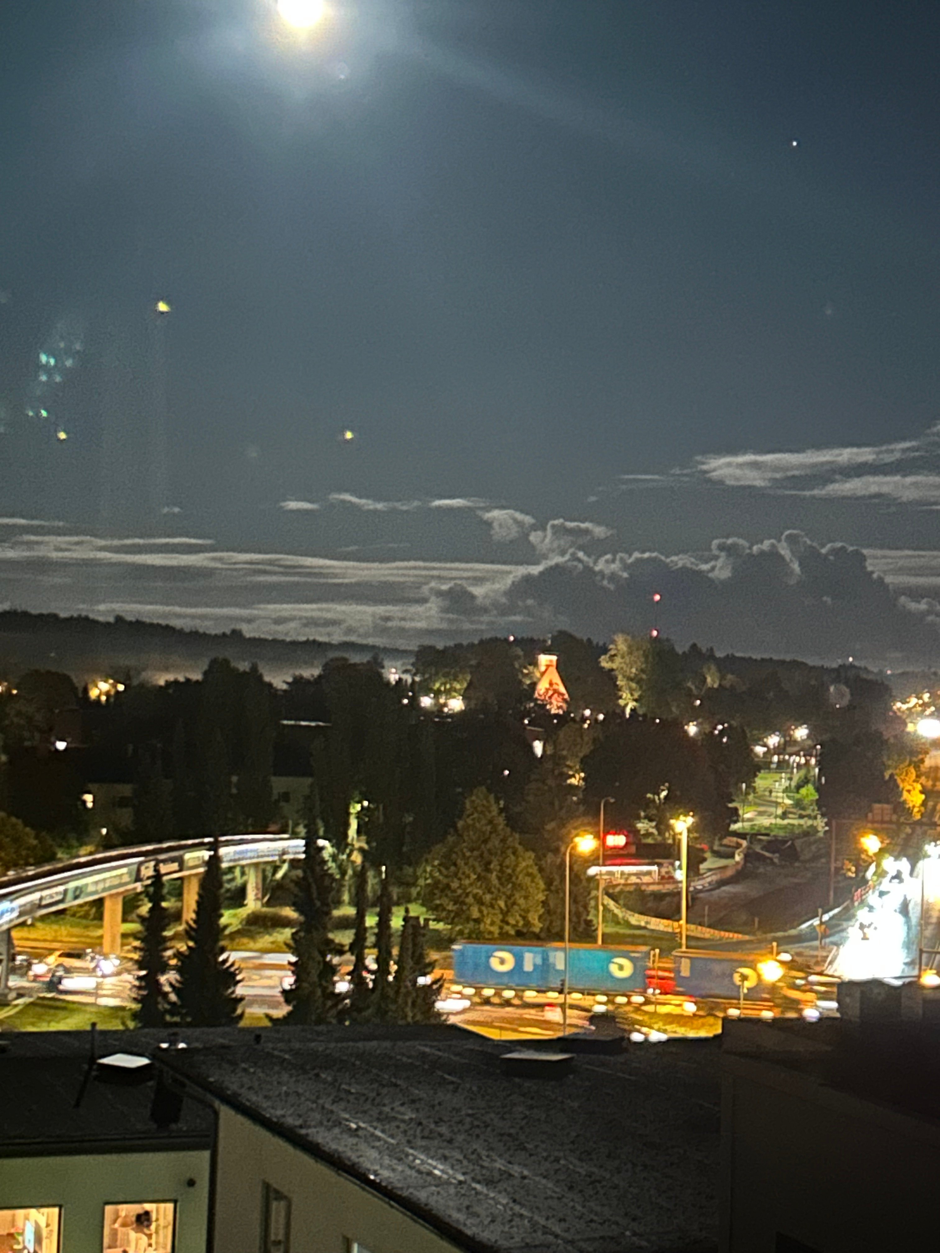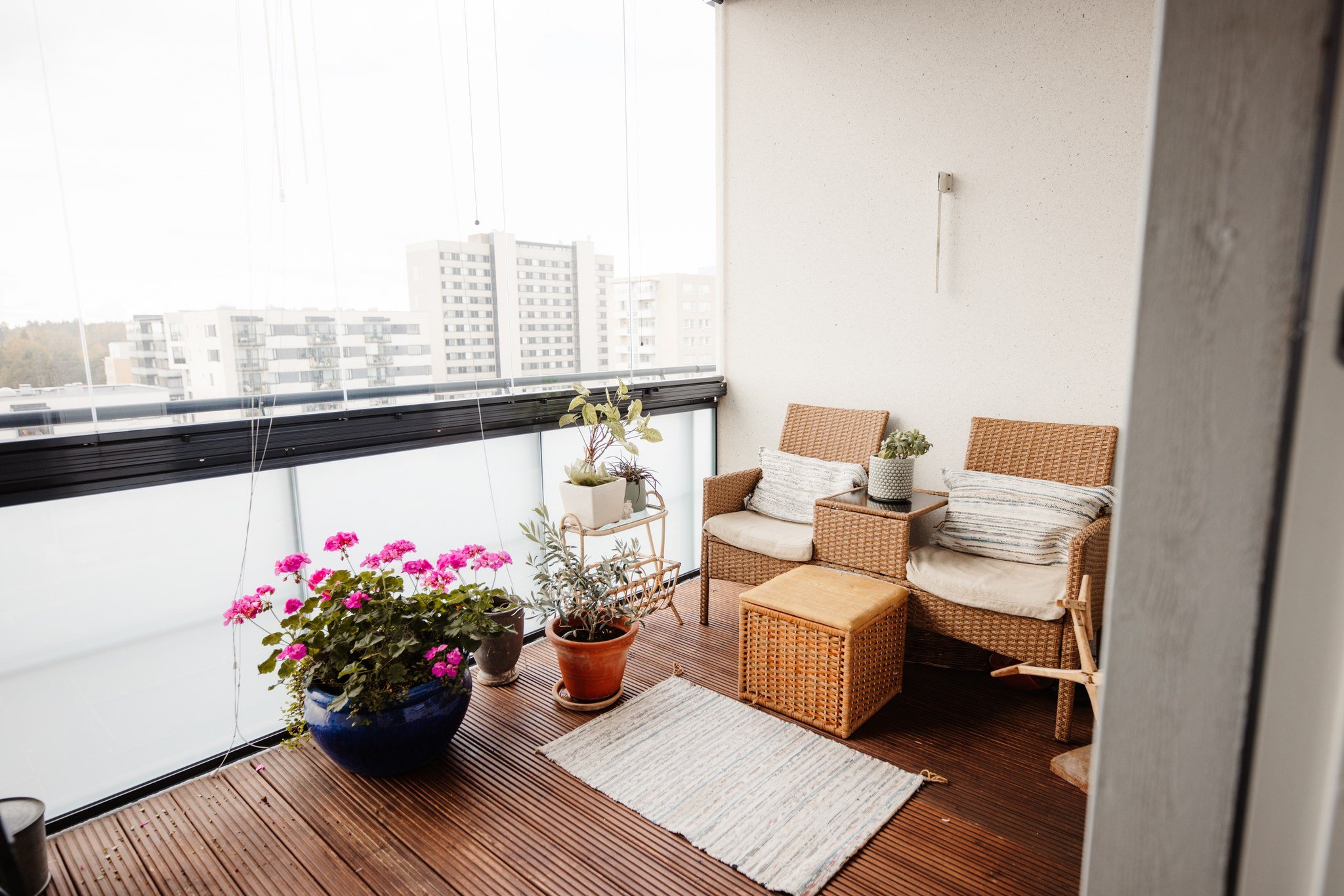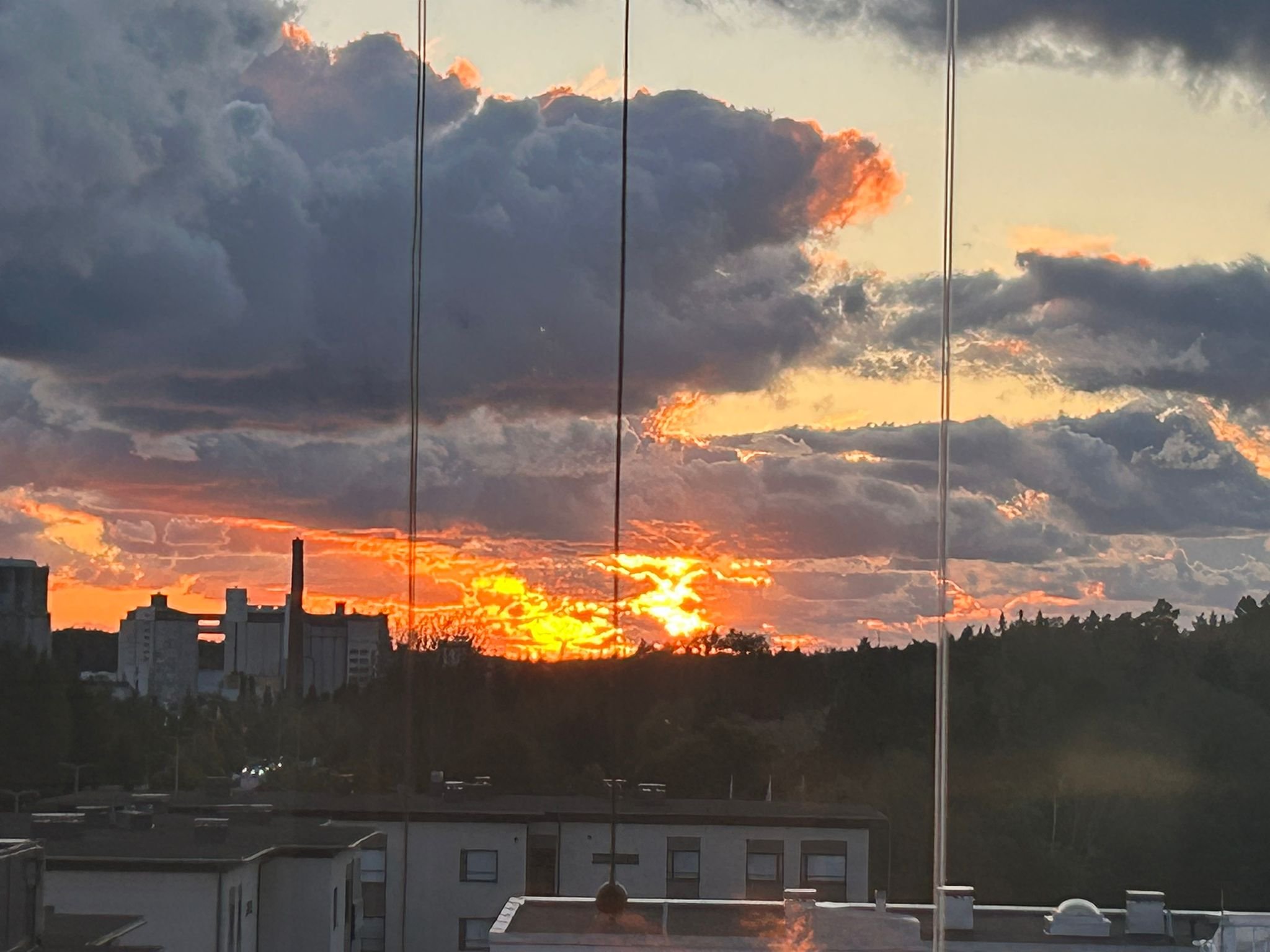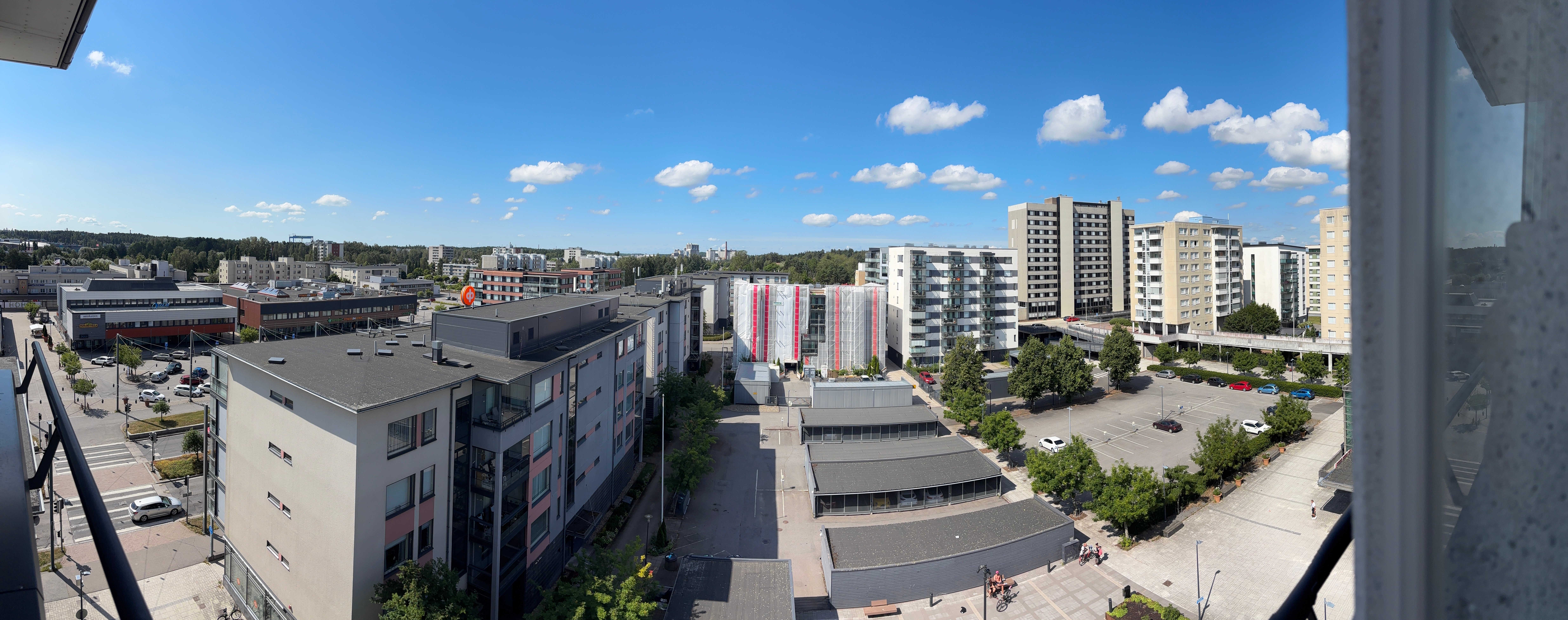 Ikkunat kolmeen suuntaan yli kattojen, etelä-itä-länsi. Parveke ilta-aurinkoon.