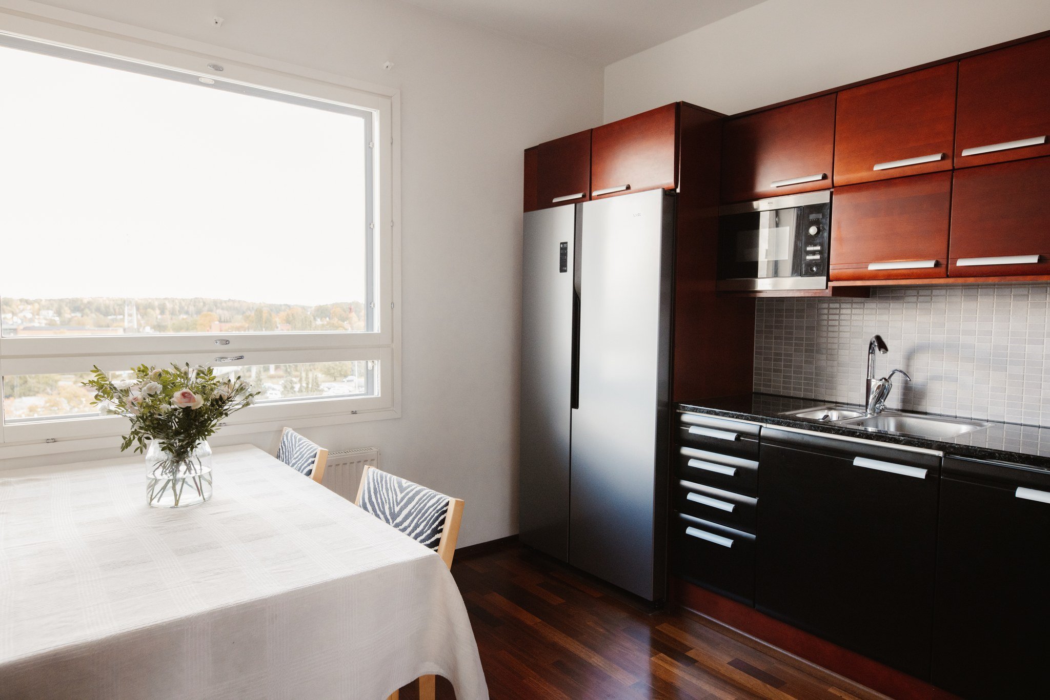 Keittiössä reilusti kaappi- ja laskutilaa. Pöytä mahtuu keittiöön hyvin.